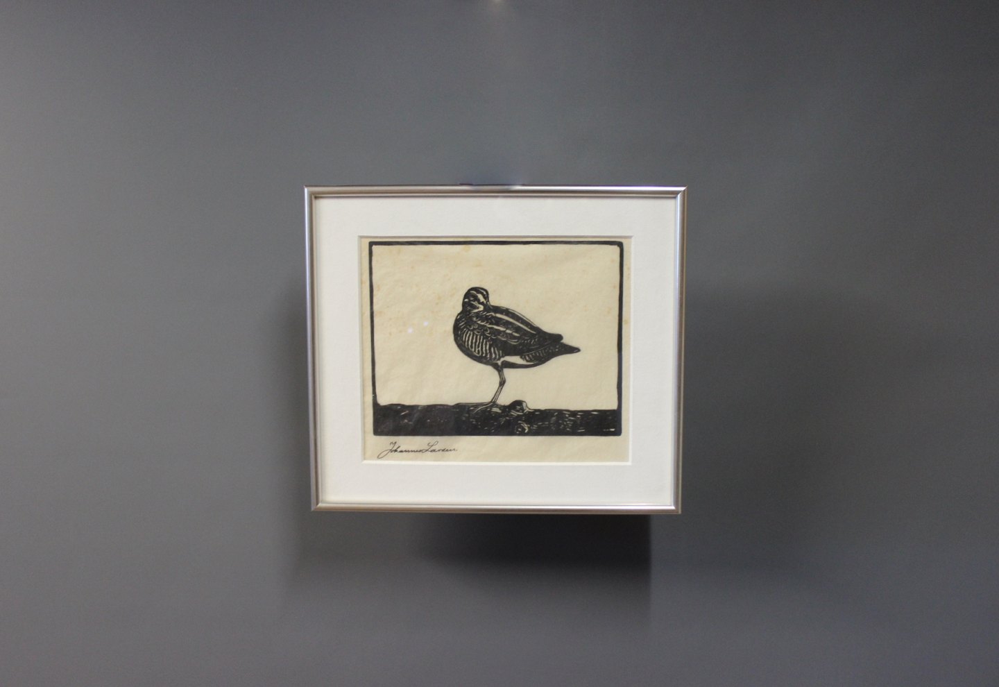 SolgtTræsnit af en sneppe på japaner papir signeret i trykket af Johannes Larsen.