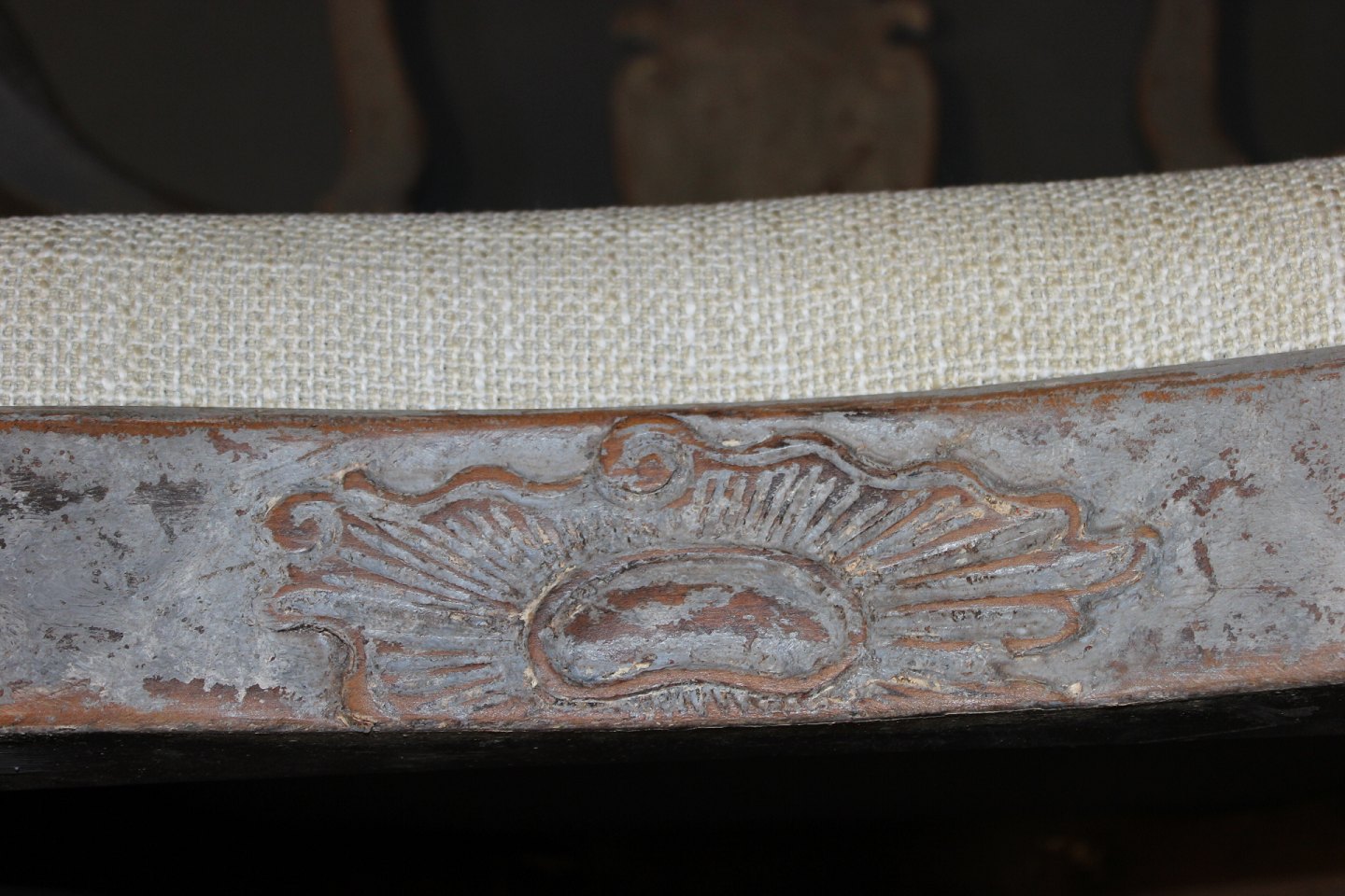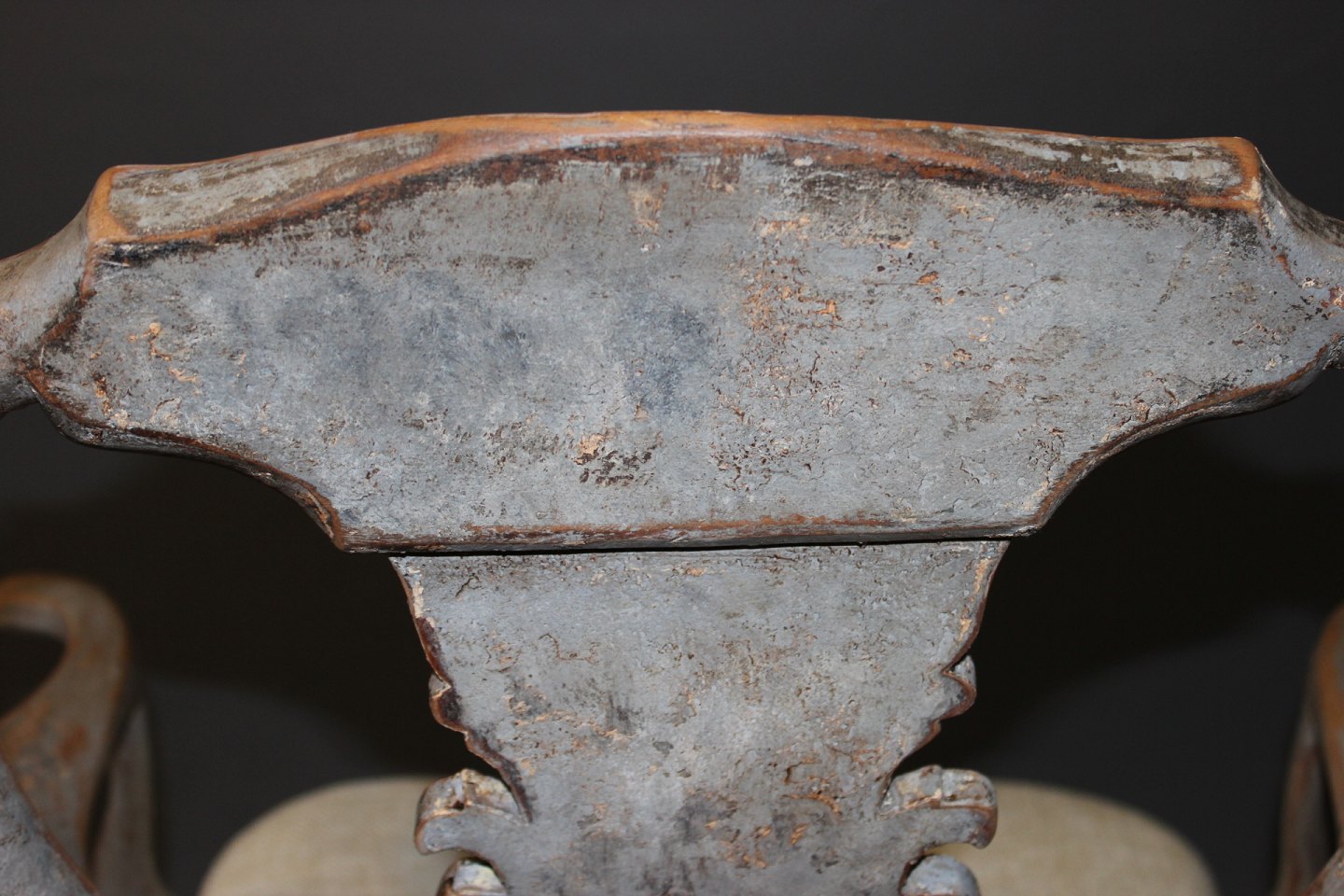 Armstol i Barok stil fra år 1760érne. Stolen er nypolstret og fremstår i rigtig flot stand. Og er gråmalet.