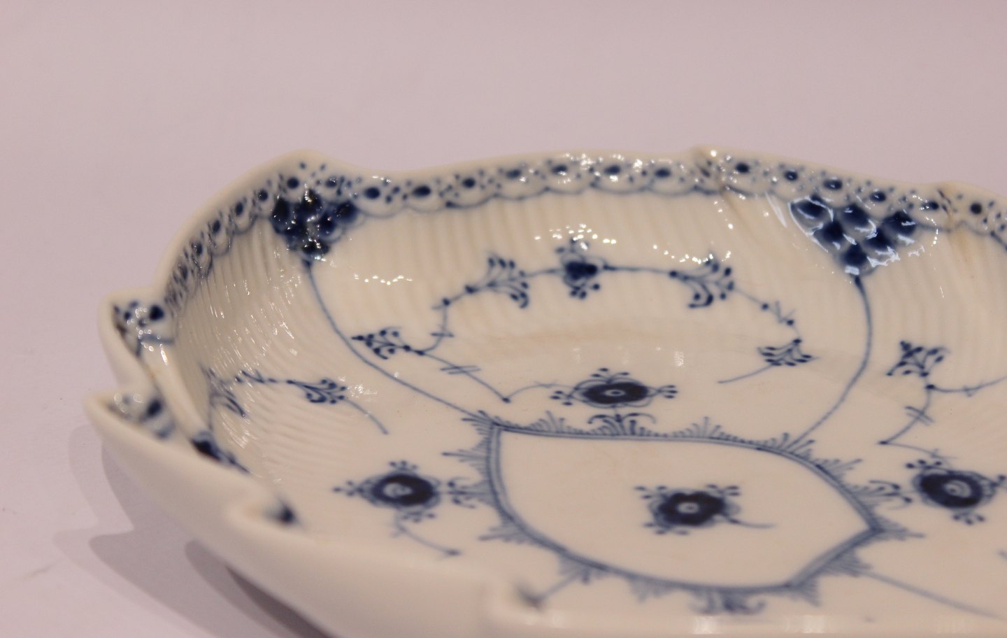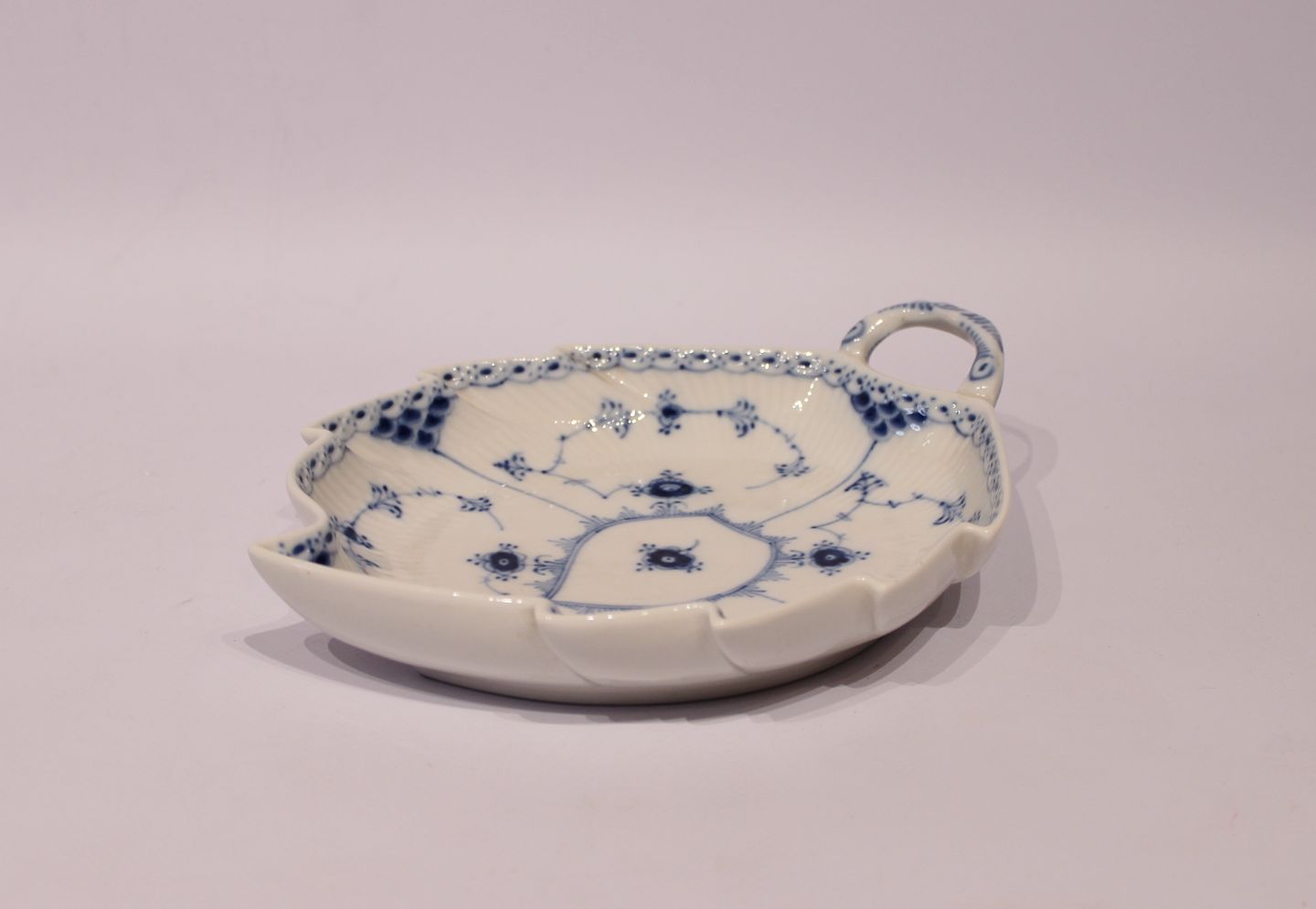 Kgl. musselmalet riflet bladformet kagefad, #1/548.