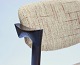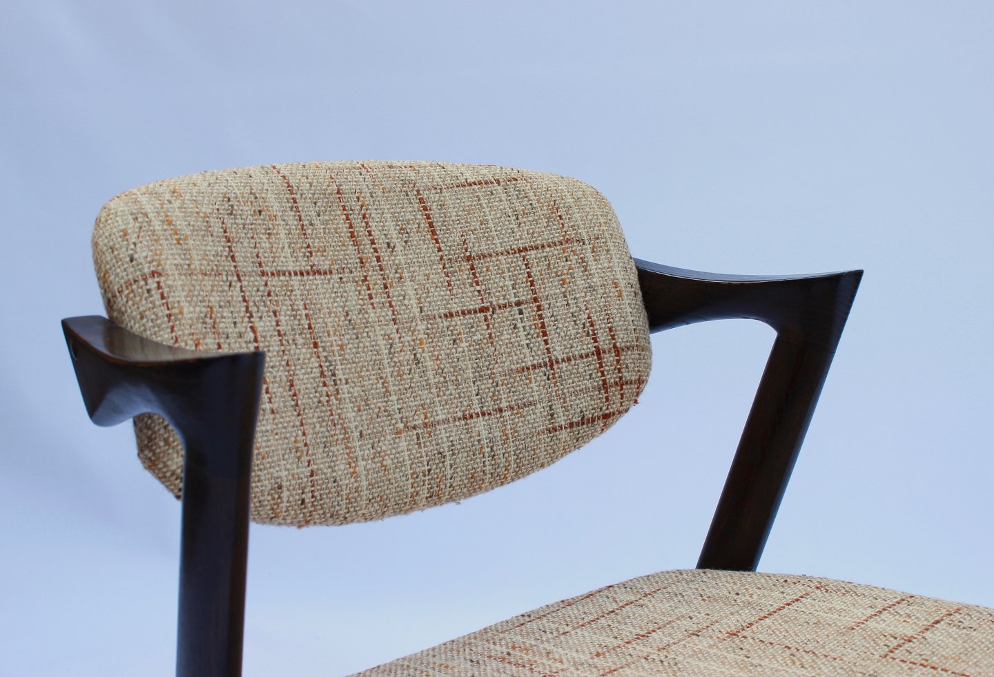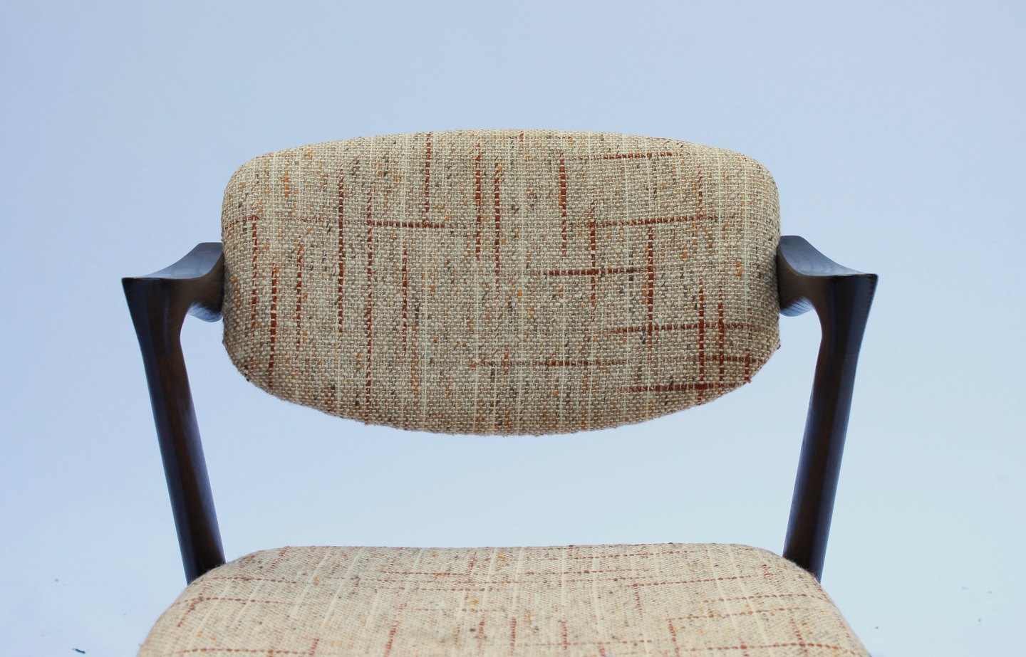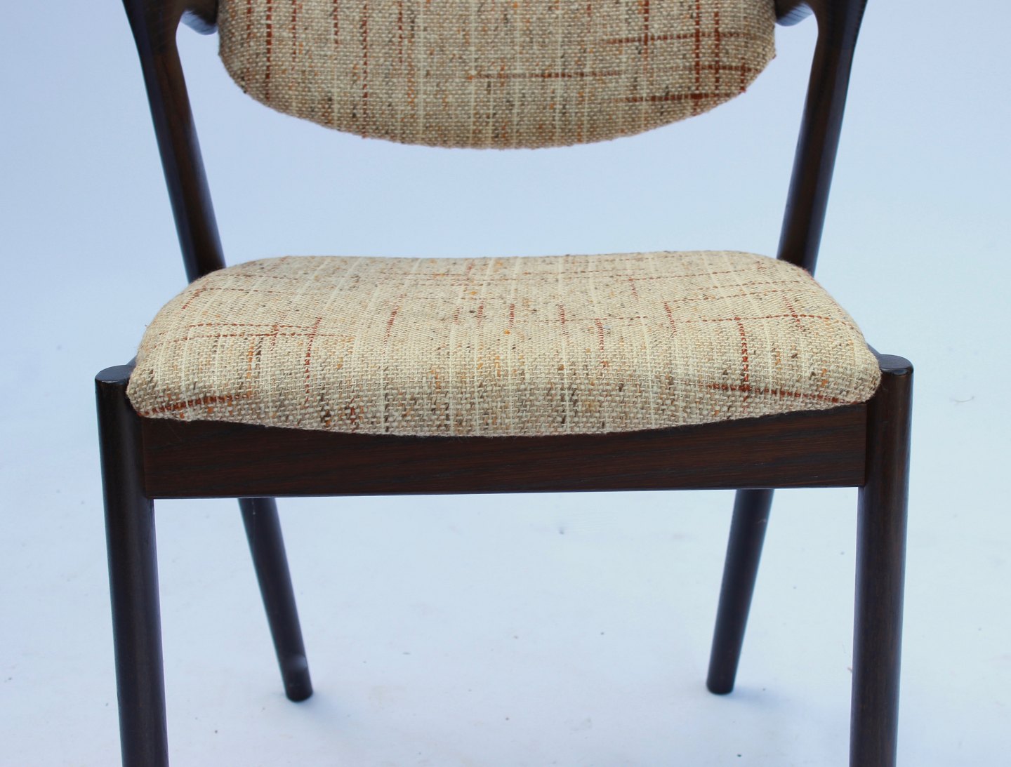 SolgtEt sæt af 6 spisestuestole, model 42, designet af Kai Kristiansen og fremstillet hos Schou Andersen i 1960erne. Stolene er af mørk eg og polstret i lyst uldstof.