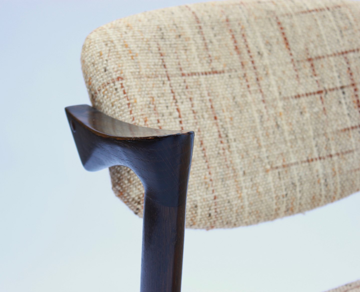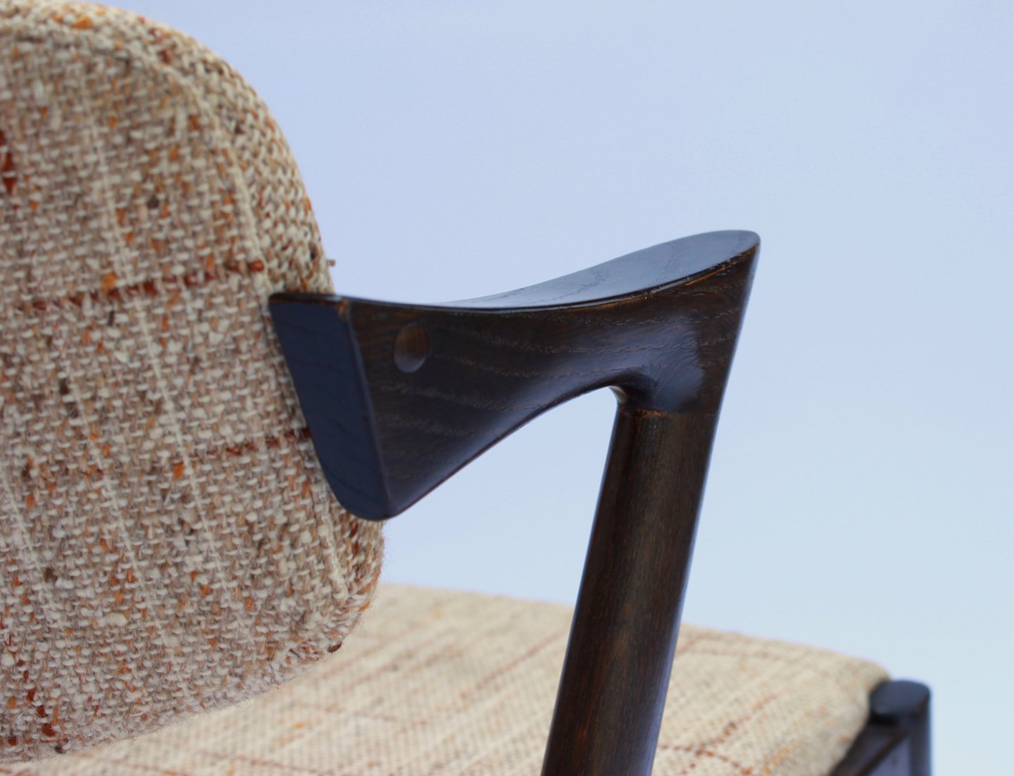 SolgtEn spisestuestol, model 42, designet af Kai Kristiansen og fremstillet hos Schou Andersen i 1960erne. Stolen er af mørk eg og polstret i lyst uldstof.