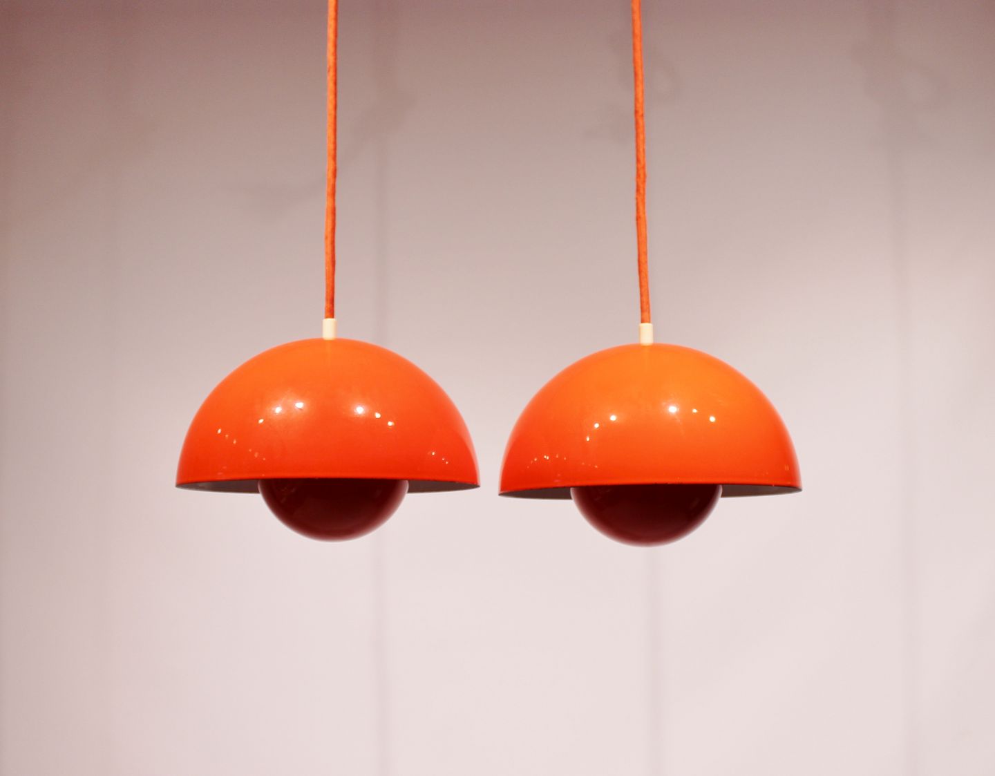 SoldA pair of Flowerpot, model VP1, pendants in orange designed by Verner Panton in 1968 and manufactured in the 1970s. The lamps are in great vintage condition.