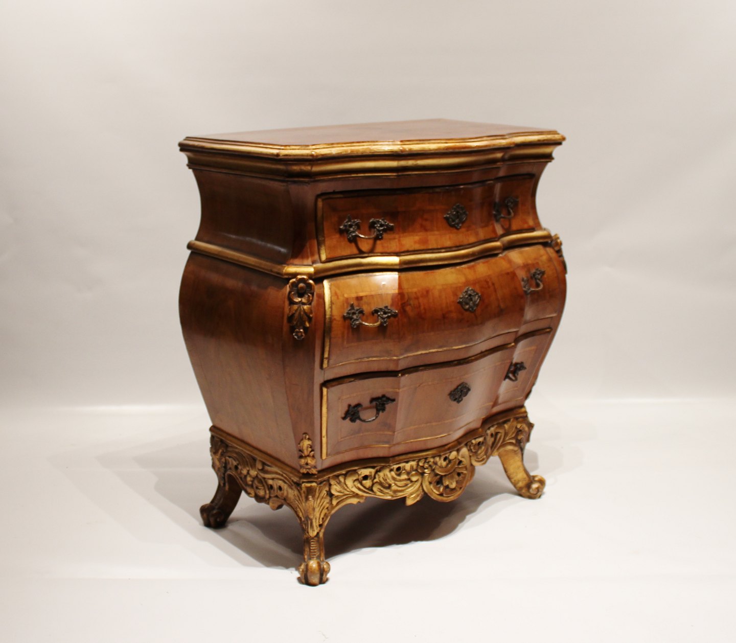 SolgtRokoko bombéformet nøddetræ kommode fra Danmark omkring år 1880. Kommoden er i flot antik stand.