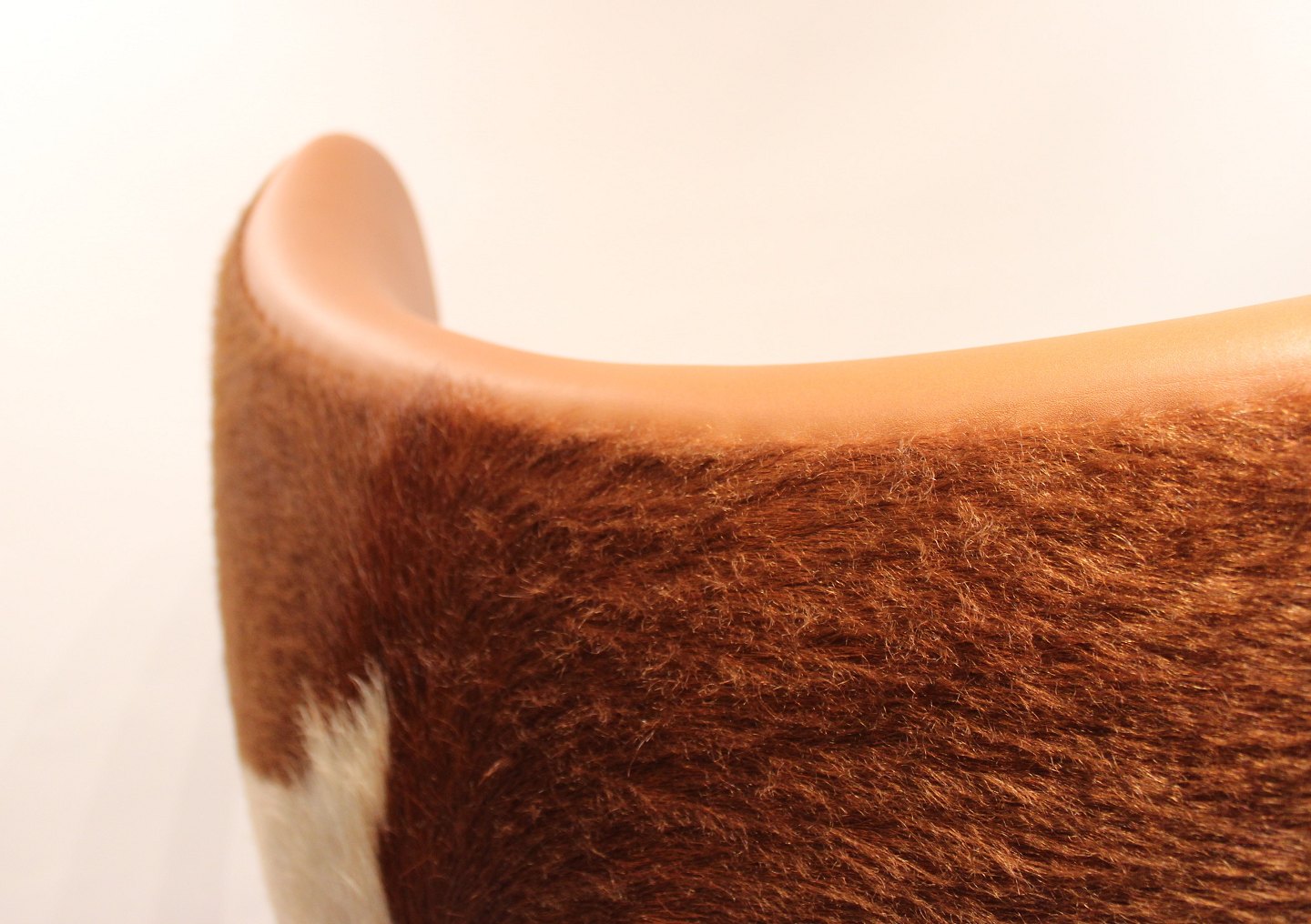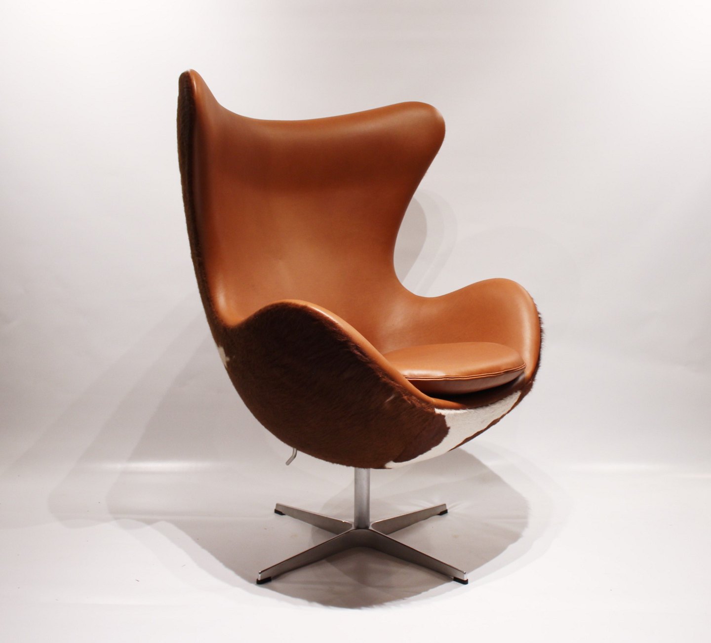 The Egg, model 3316, special edition, designed by Arne Jacobsen in 1958 and manufactured by Fritz Hansen in the 1980s. The chair is upholstered with cowhide and cognac colored leather. The item is in great vintage condition.
