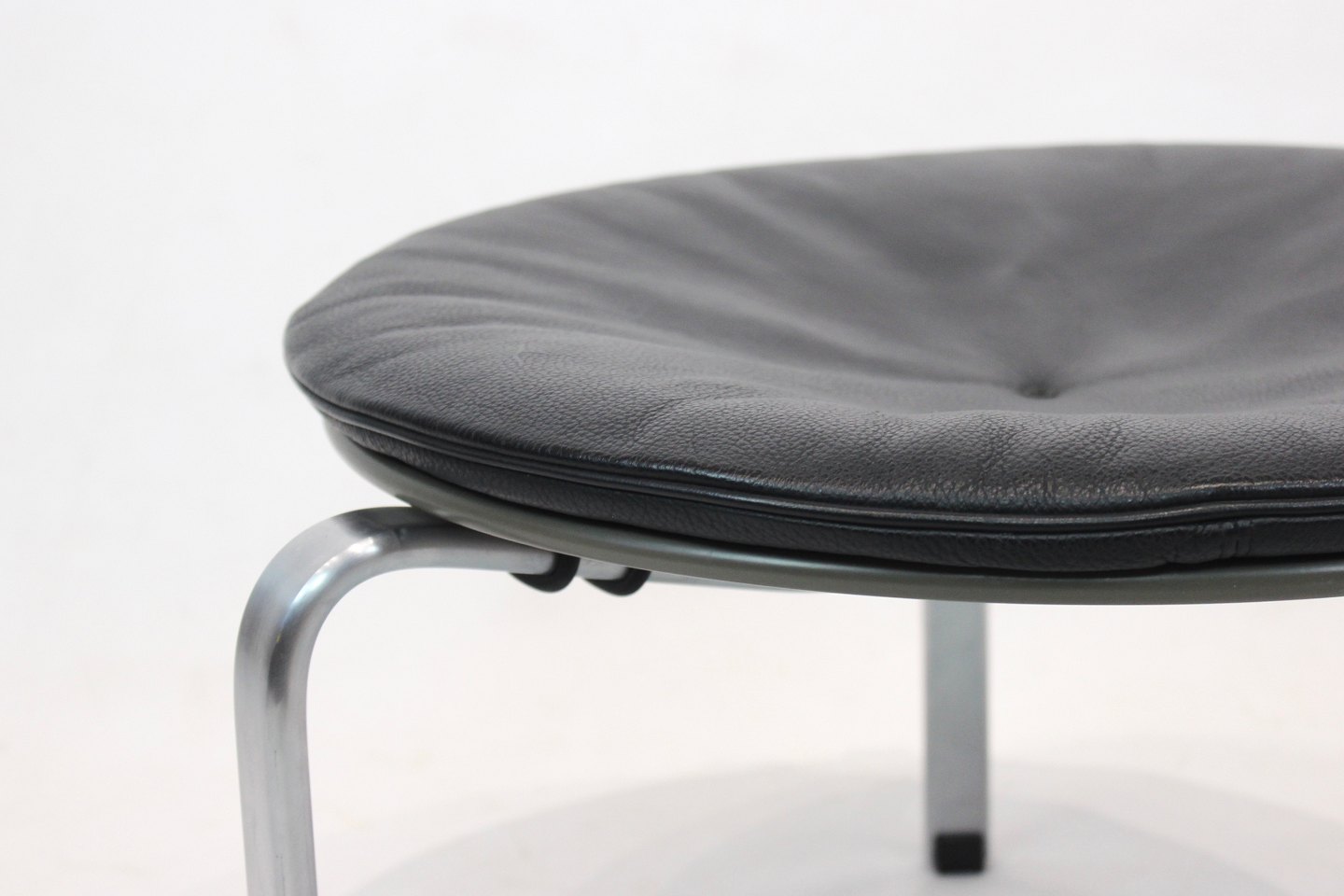 SoldStool, model PK33, with seat of black leather and frame of matt chrome spring steel, designed by Poul Kjærholm and manufactured by Fritz Hansen in 2004. The stool is in great used condition.