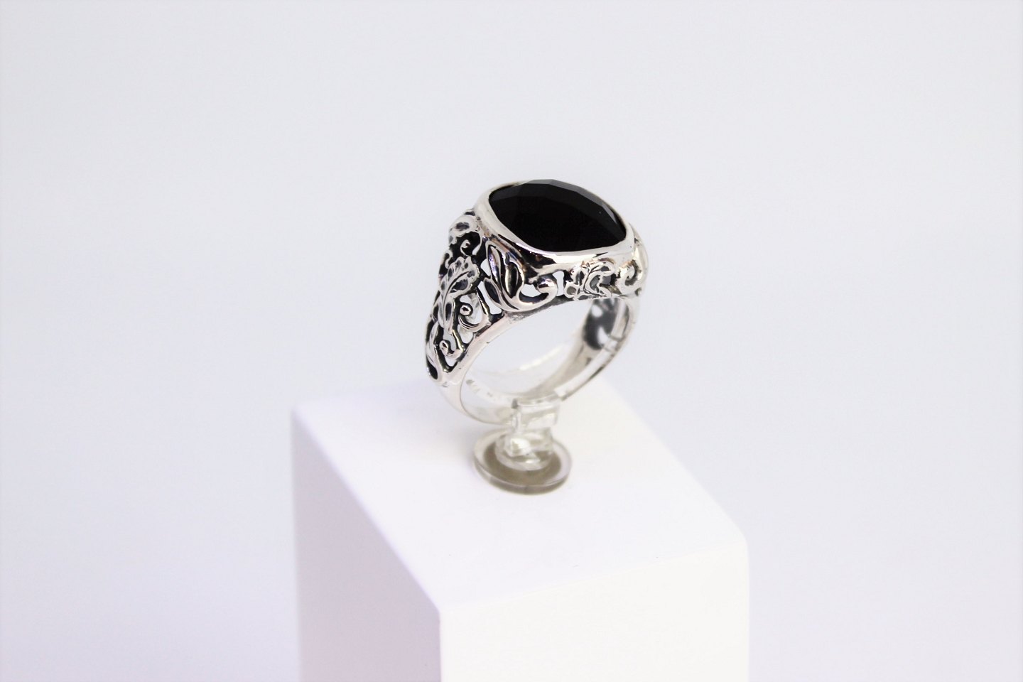 Ring of 925 sterling silver decorated with pattern and black onyx, stamped LUND.