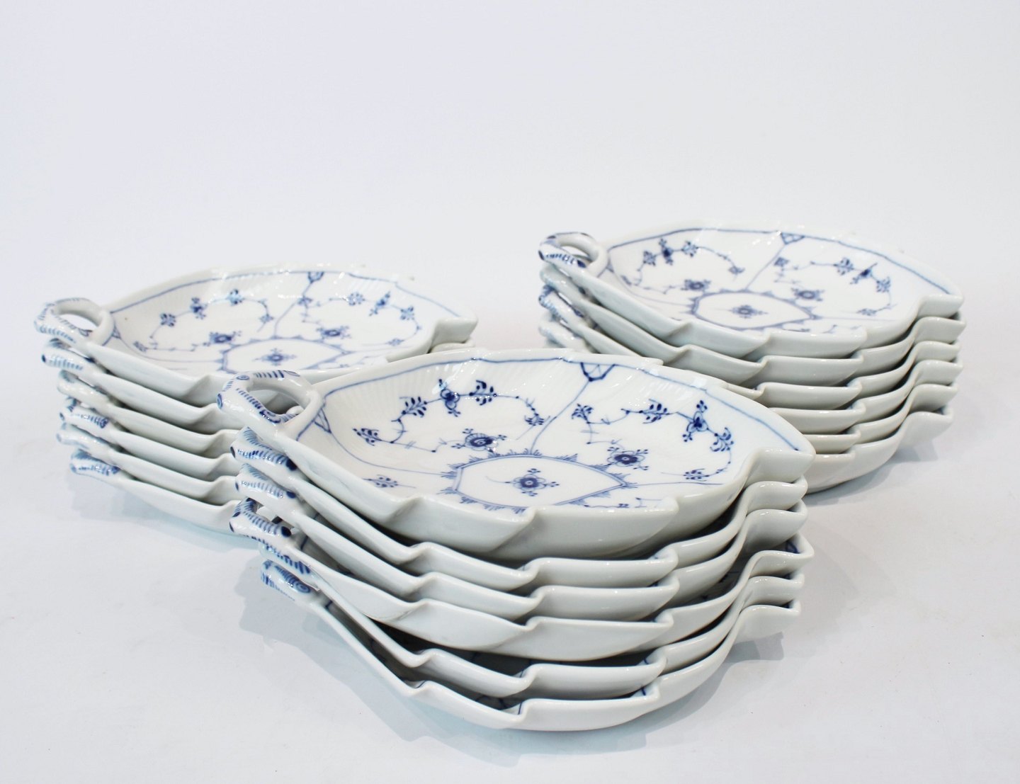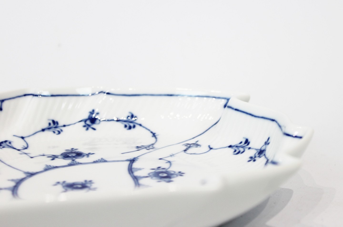 SolgtKgl. Musselmalet riflet bladformet tallerken, nr.: 1/144. Som det ses ud fra foto, har vi en del på lager, spørg for bestemt antal.
