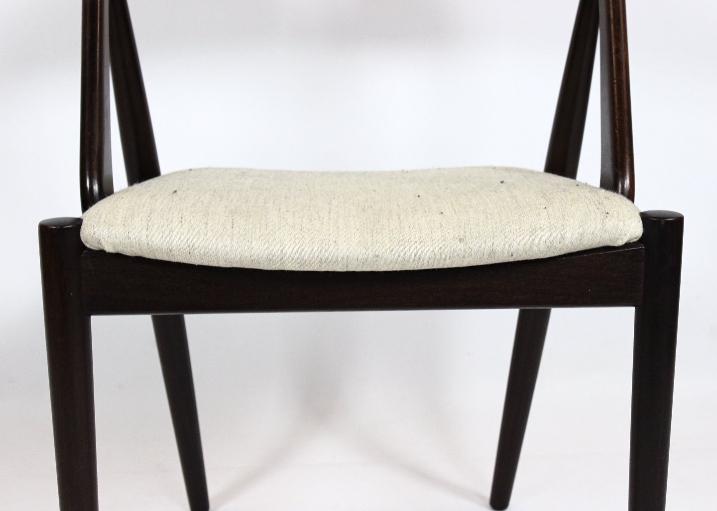 SolgtEt sæt af seks spisestuestole, model 31, designet af Kai Kristiansen i 1956 og fremstillet hos Schou Andersen i 1960erne. Stolene er i teak og polstret i lyst stof.