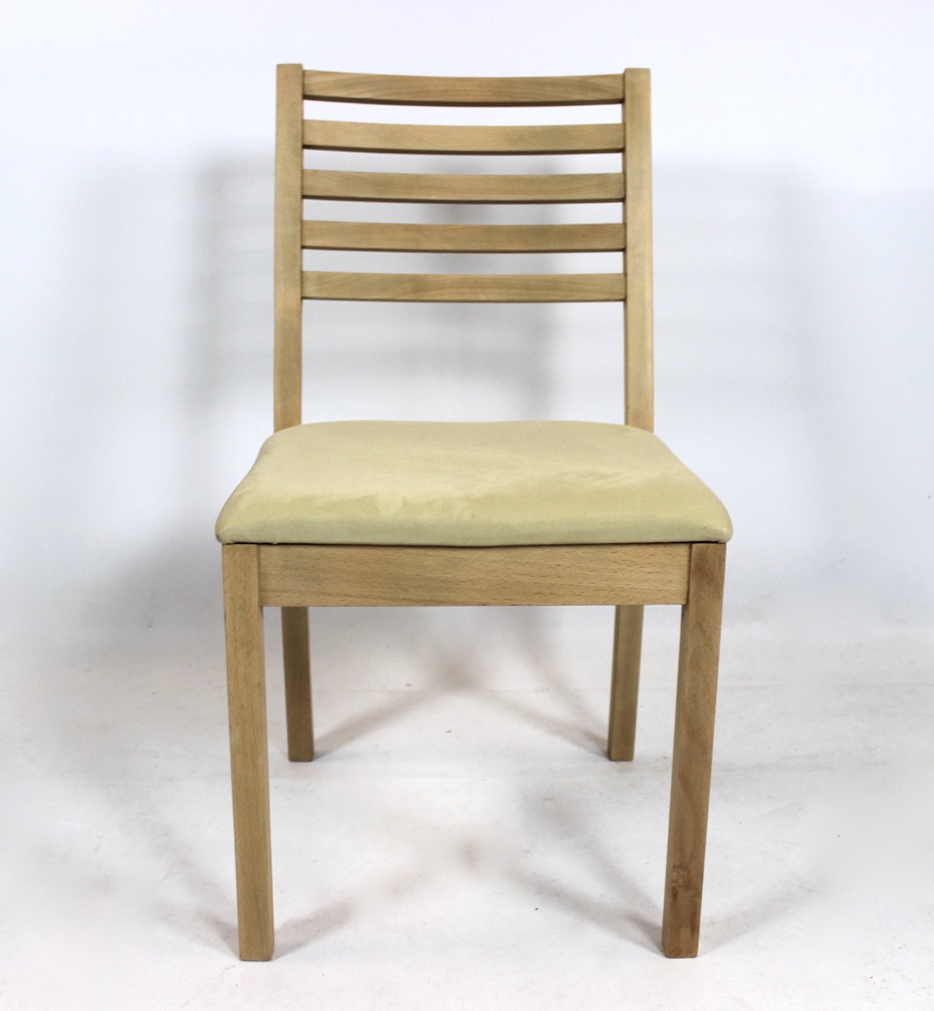 Stolene er konstrueret af solidt bøgetræ, hvilket giver dem både en naturlig skønhed og en stærk, holdbar struktur. Den lyse stofpolstring tilføjer en behagelig komfort og et elegant udseende til sædet og ryglænet, hvilket gør dem velegnede til lange middage eller afslappede måltider.