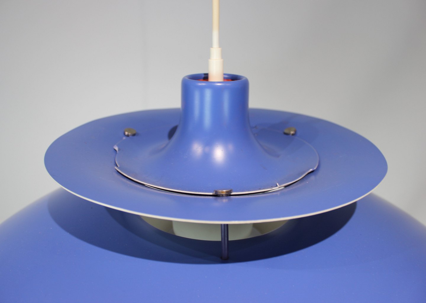 PH5 pendant designed by Poul Henningsen in 1958 and manufactured by Louis Poulsen. The pendant has blue lacquered metal Shades.