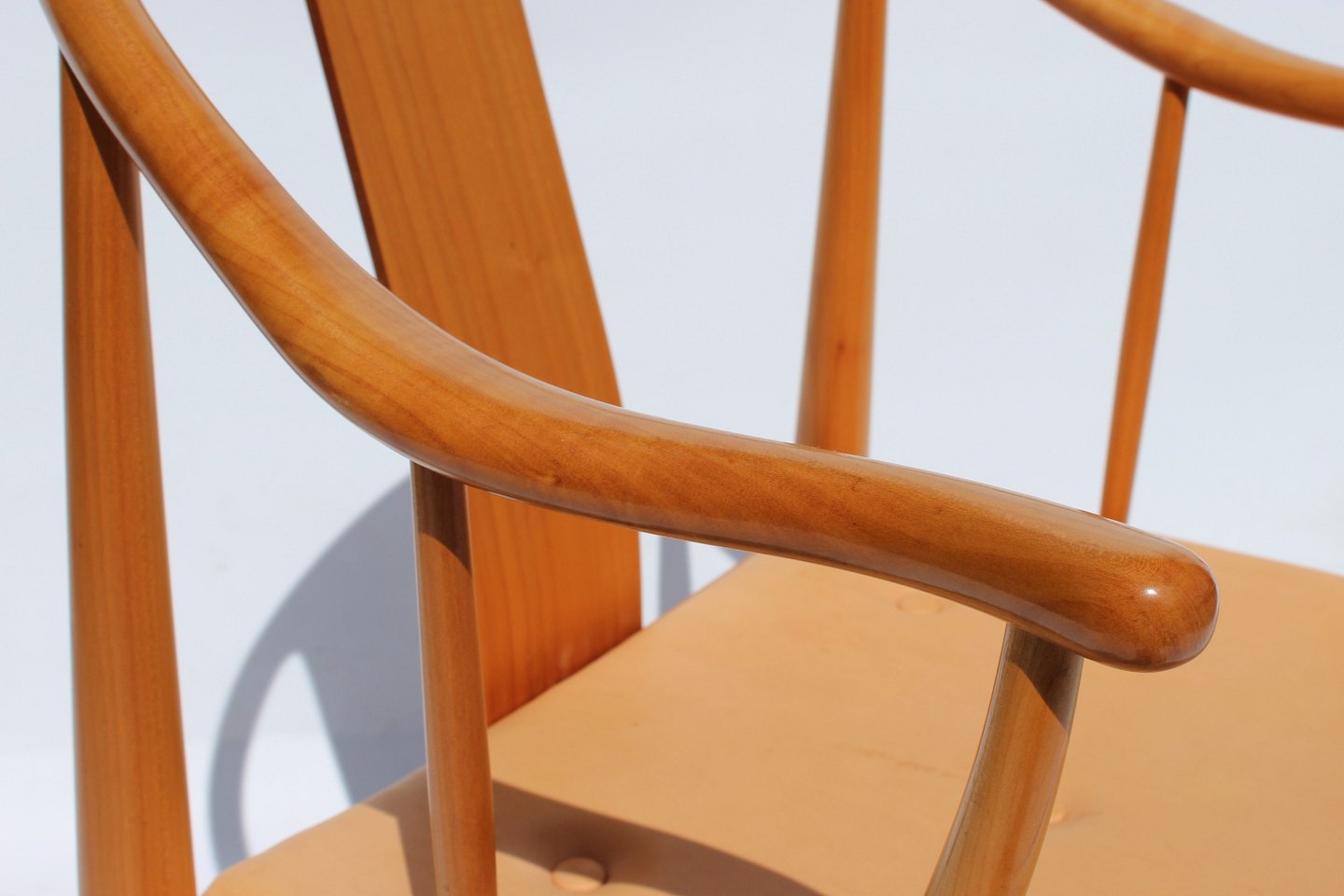 SoldA set of four China chairs, model 4283, designed by Hans J. Wegner in 1944 and manufactured by Fritz Hansen in 1999. The chairs are of cherry and with cushion of patinated leather. 2 chairs left.