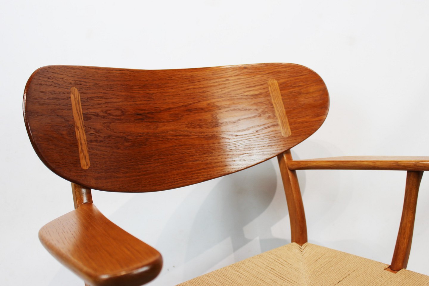 Armchair, model CH22, of oak and papercord designed by Hans J. Wegner and manufactured by Carl Hansen & Son in the 1950s. The chair is in great original condition with new papercord.