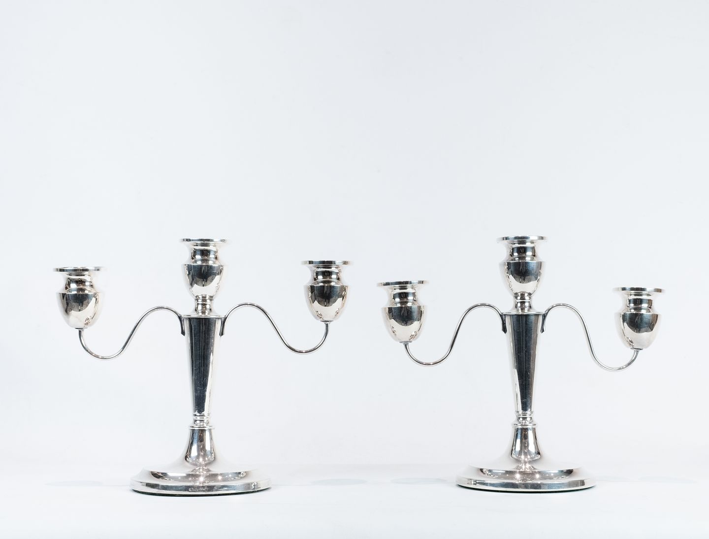SolgtEt par tre armede lysestager af 830 sølv og signeret E.T.J. Begge er i flot stand.