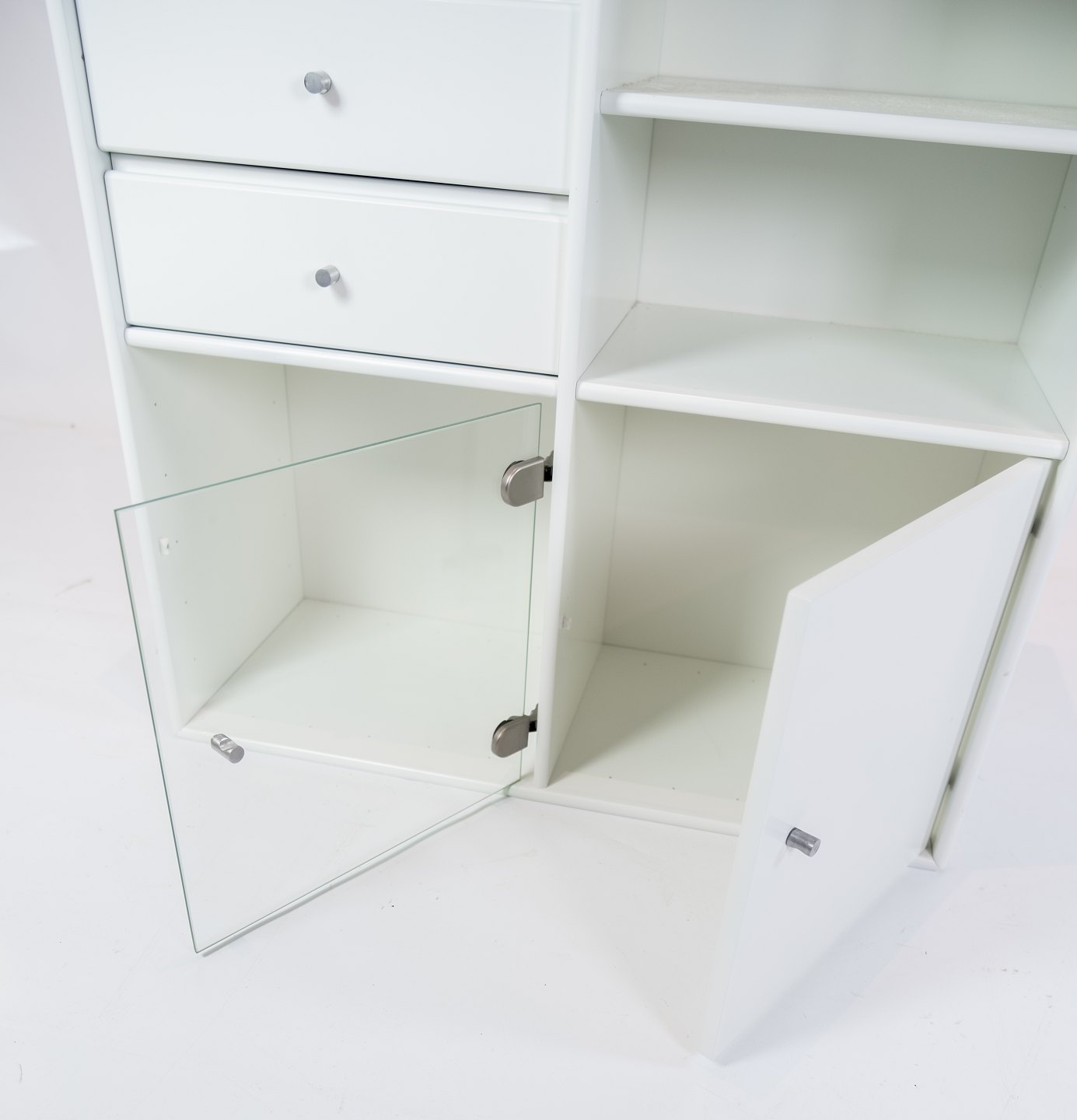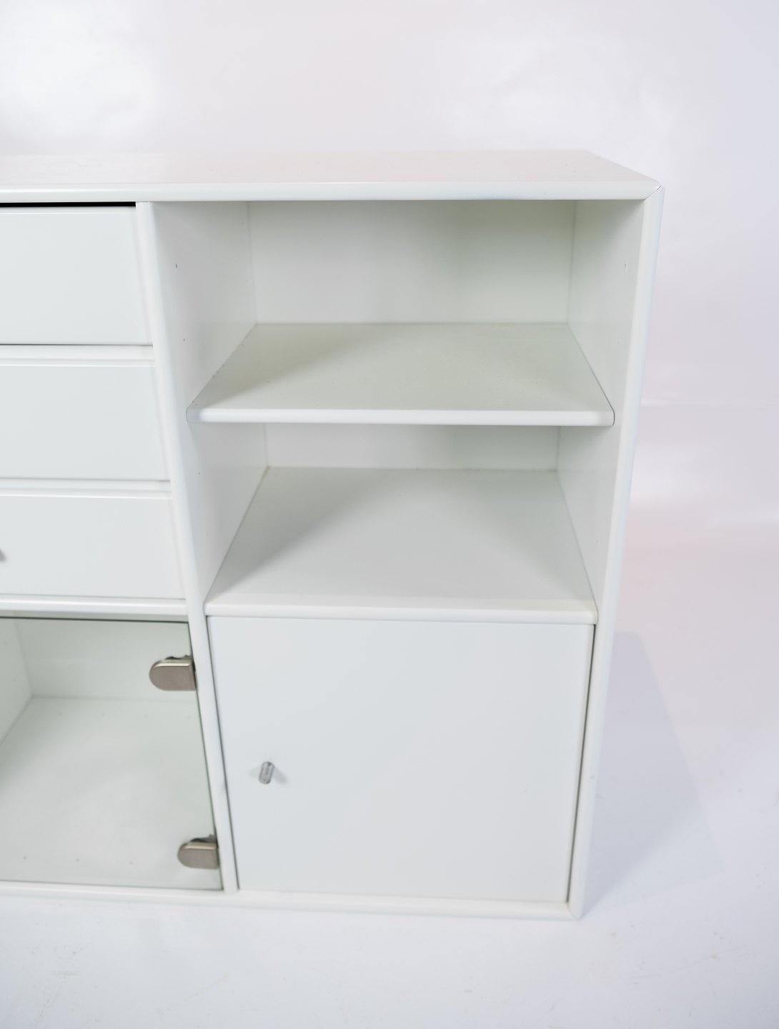White Montana module with 3 drawers, 2 shelves and 2 rooms with a glass and regular door, designed by Peter J. Lassen.