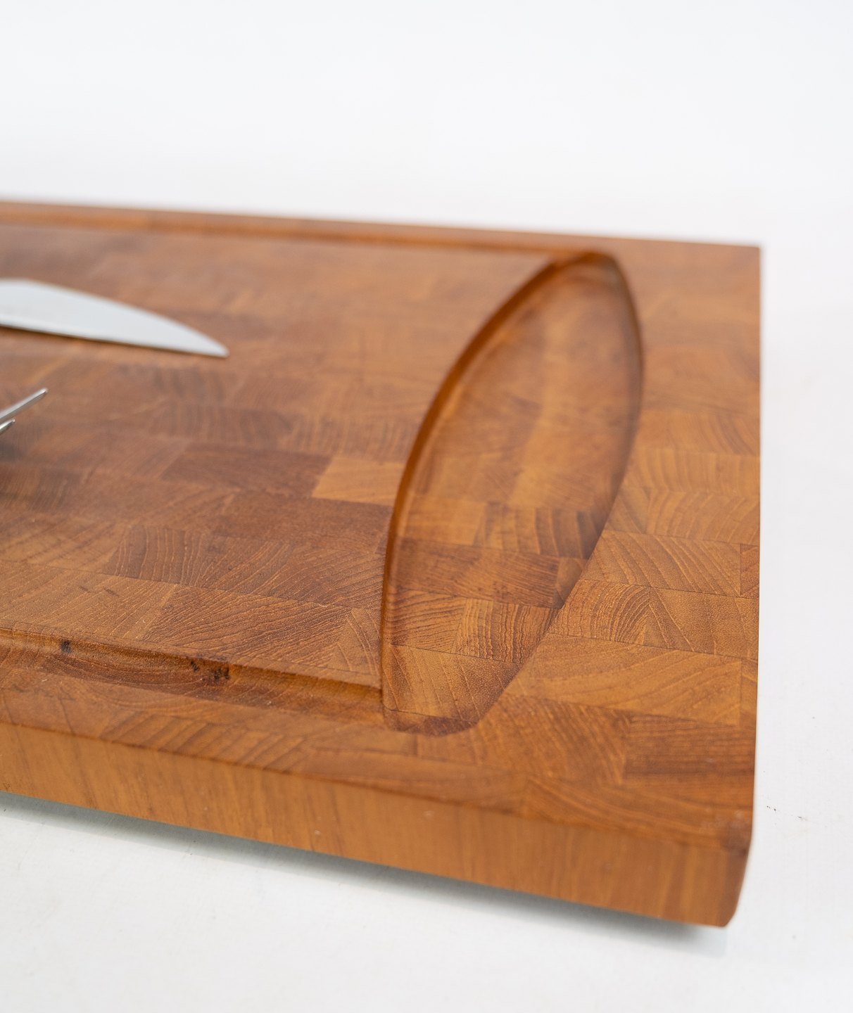 Skærebræt i teak og tilhørende forskærersæt i stål af Digsmed, Denmark.
