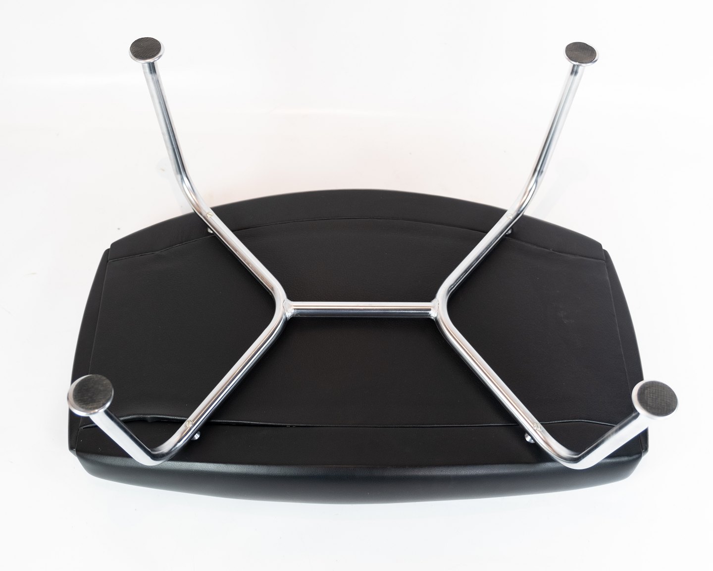 SolgtSkammel til Ox chair, model EJ 100-F, polstret i sort læder, designet af Hans J. Wegner i 1960erne og fremstillet hos Erik Jørgensen Møbelfabrik.