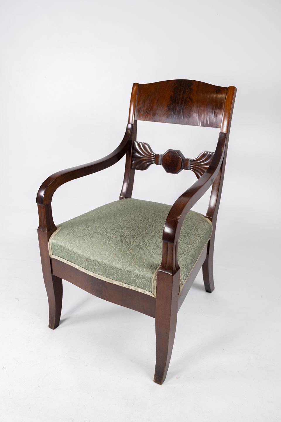 Armstol af mahogni og polstret med grønt stof fra 1860erne. Stolen er i flot brugt stand.