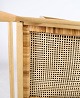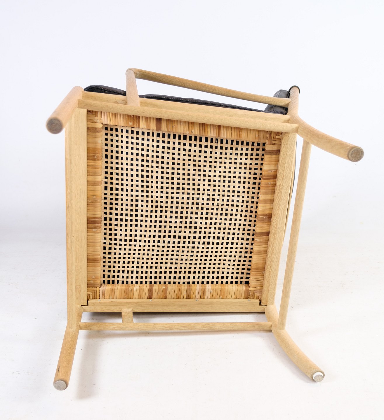 Stolene har flotte sorte læderhynder, der er polstret for optimal komfort. Læderet er af høj kvalitet og giver et klassisk og elegant look til stolene. Sædet på stolen er håndvævet i flet, hvilket giver en smuk og unik tekstur til stolen, og sædet er fastgjort til stellet med fine detaljer i messing, der tilføjer en ekstra touch af elegance.
