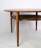 Coffee table, model FD 515, designed by Peter Hvidt 1916-1986 & Orla Mølgaard-Nielsen 1907-1993 made in teak wood from 1956. The coffee table is fitted with a wicker newspaper shelf and brass fittings. Made by the manufacturer France