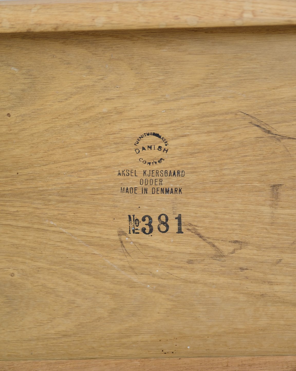 Aksel Kjersgaard er kendt for sit fokus på enkelhed og brug af naturlige materialer, og dette afspejles tydeligt i disse sideborde. Hvert bord er udført med omhu og bærer originale brandmærker, hvilket understreger deres autenticitet og ægthed.