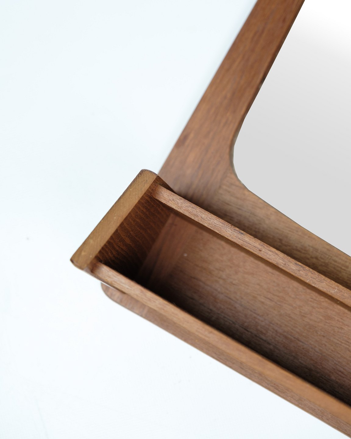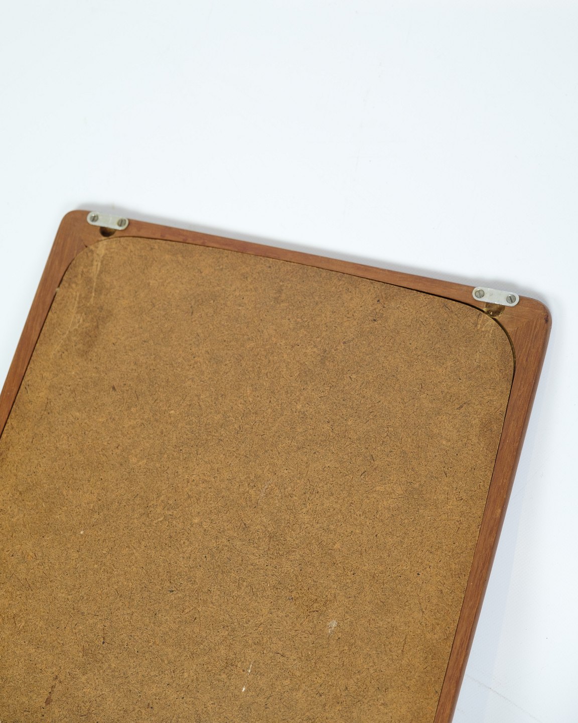 Spejl i teak fra 1960'erne. Rammen er lavet af teaktræ, der giver spejlet en varm og naturlig glød. Med sit enkle og funktionelle design er dette spejl et godt eksempel på dansk møbelhåndværk fra midten af det 20. århundrede.