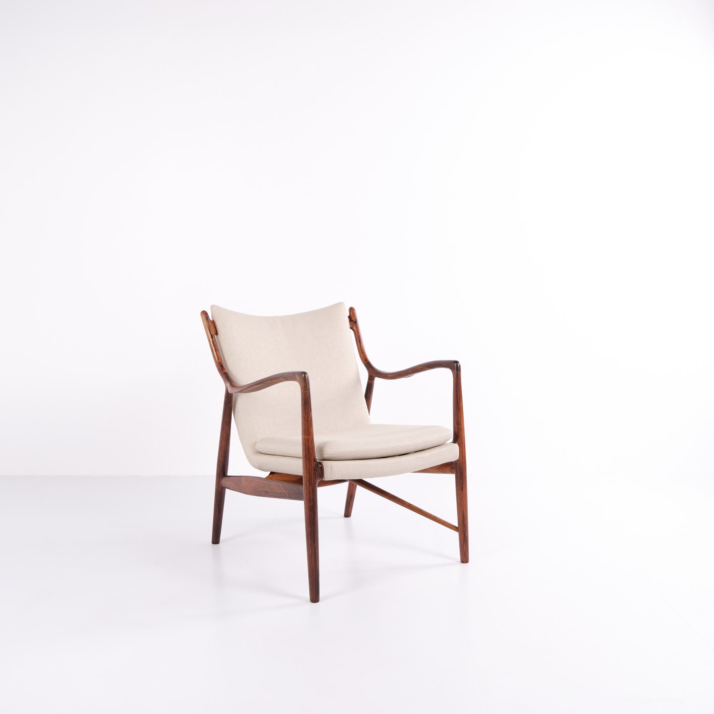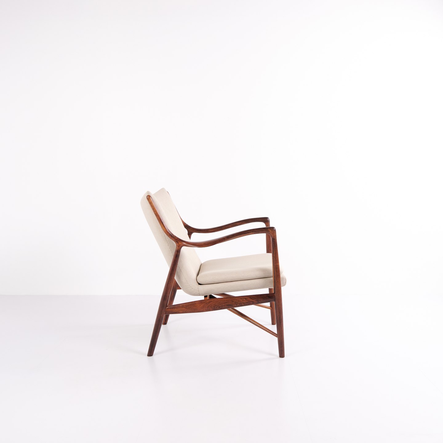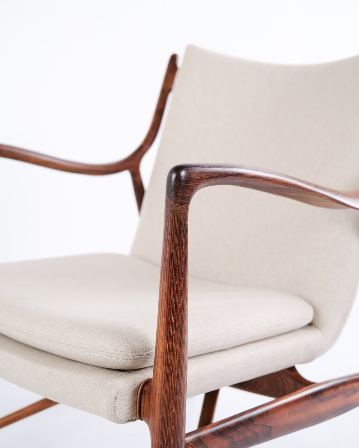 SoldIconic armchair, model NV45, designed by Finn Juhl and made by master cabinetmaker Niels Vodder in the 1950s. The chair is made of rosewood with a cantilevered seat and back upholstered in light fabric, which highlights Finn Juhl's characteristic sculptural design and light construction.