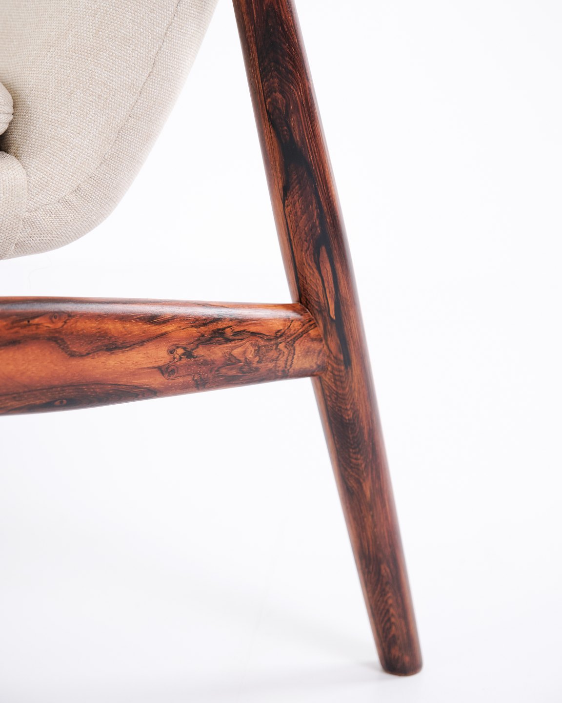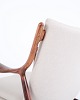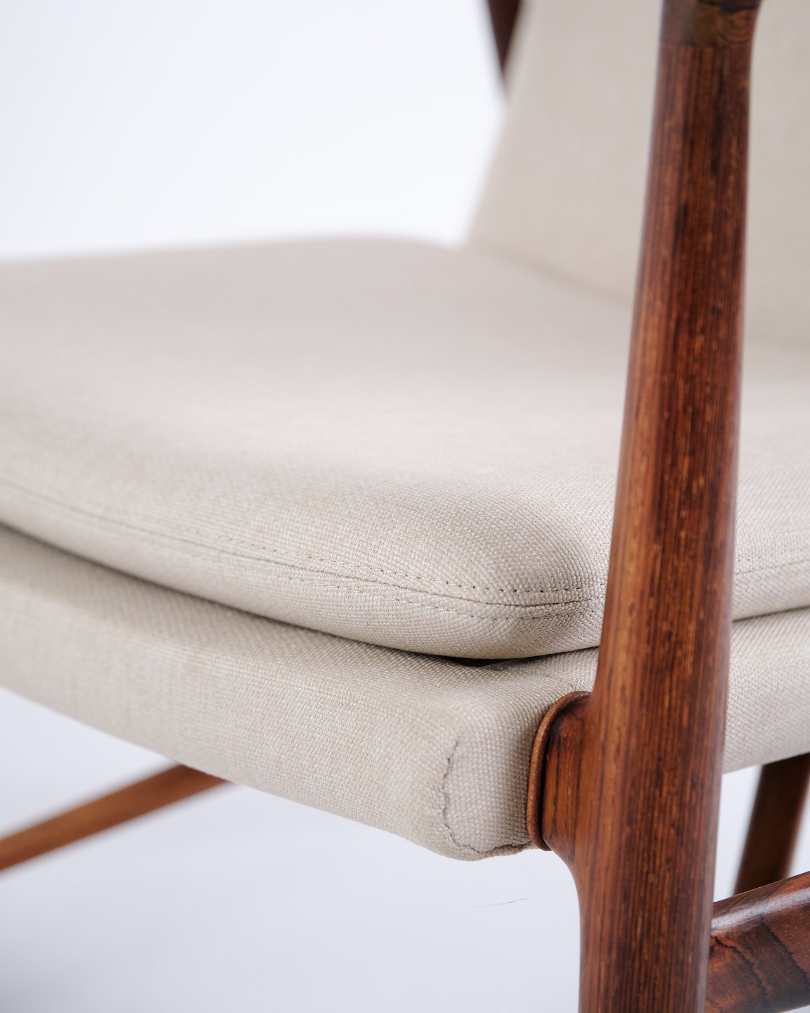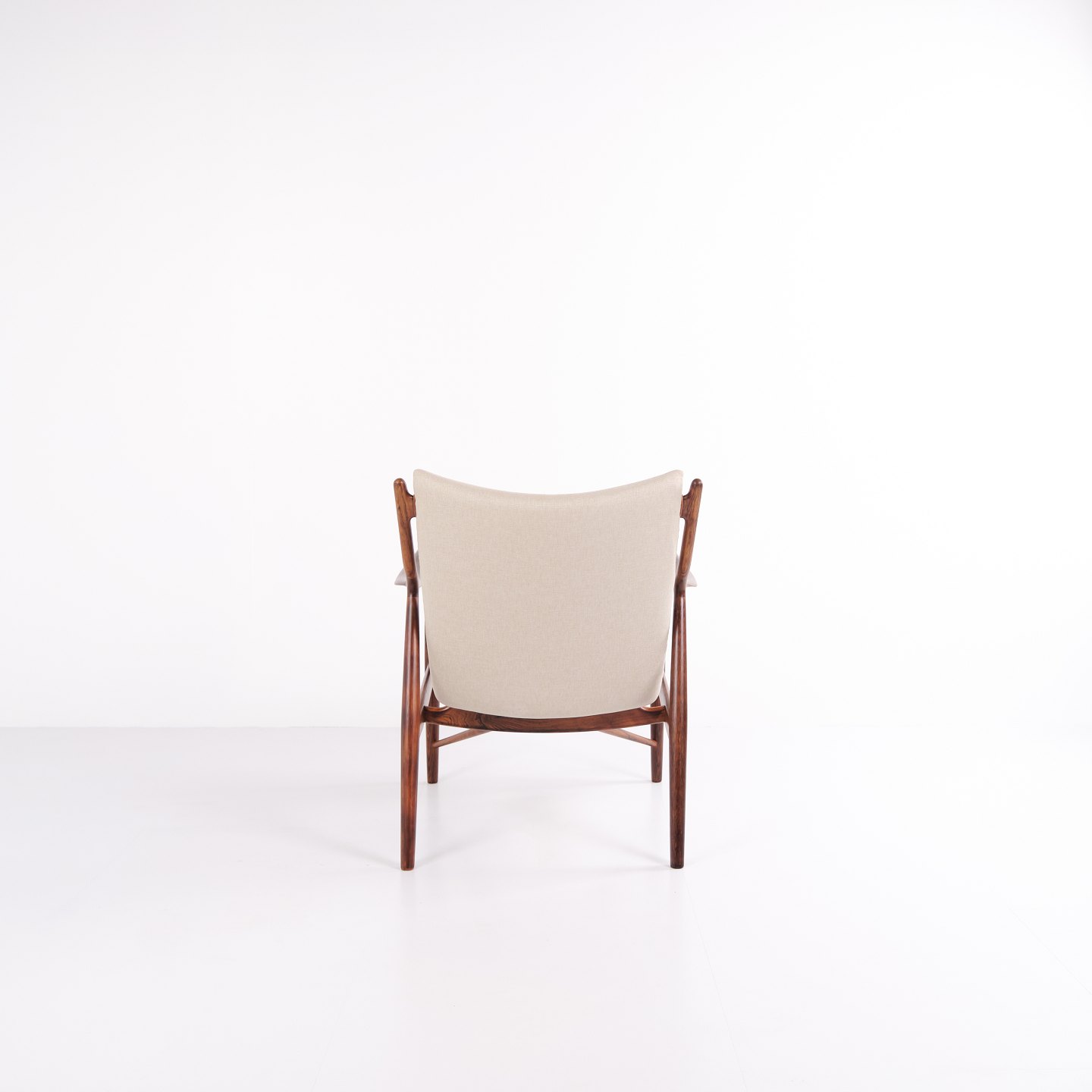 SoldIconic armchair, model NV45, designed by Finn Juhl and made by master cabinetmaker Niels Vodder in the 1950s. The chair is made of rosewood with a cantilevered seat and back upholstered in light fabric, which highlights Finn Juhl's characteristic sculptural design and light construction.