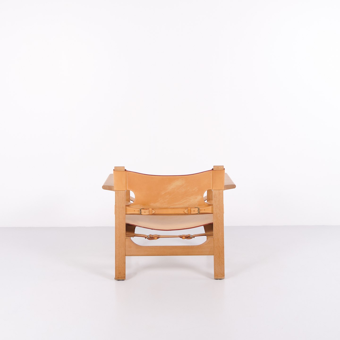 Børge Mogensen Den Spanske Stol model BM2226 i naturligt patineret kernelæder fra 1960’erne. Klassisk dansk designikon med robust udtryk.