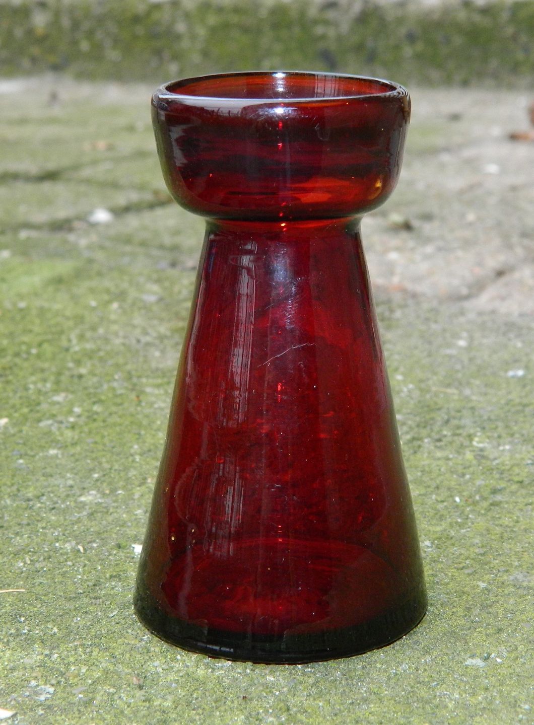 Løgglas til tulipaner fra Holmegaard Glasværk ca. 1900 i rødt glas. Fremstår i perfekt stand. Navlemærket (knækket) på bunden. 10 cm højt.