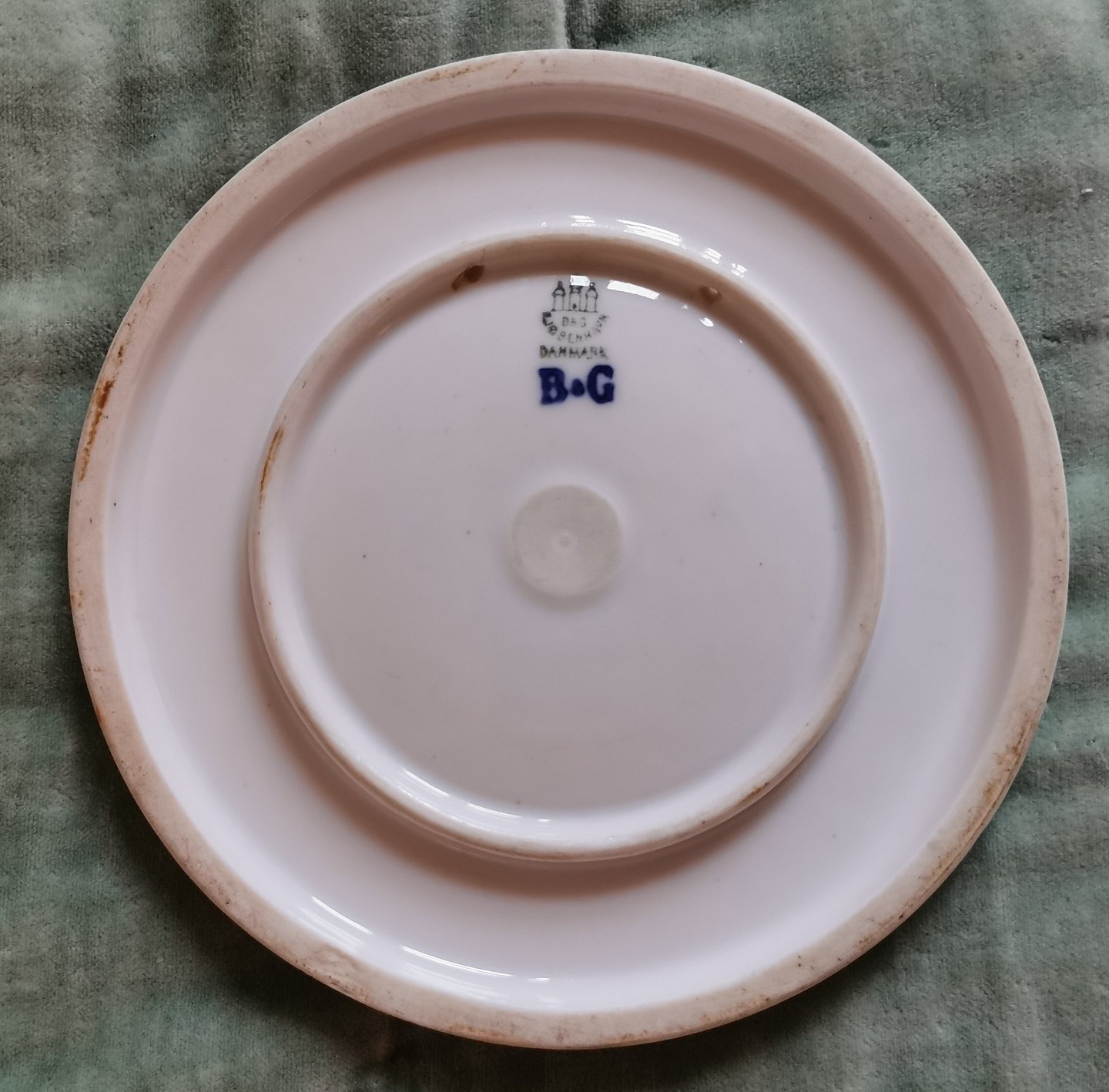 Forhandler platte fra B&G: Dekoration med teksten Bing & Grøndahl Kjøbenhavn samt fabrikslogo med de tre tårne. I perfekt stand. Fabriksmærket på bagsiden. Diameter på 14½ cm.