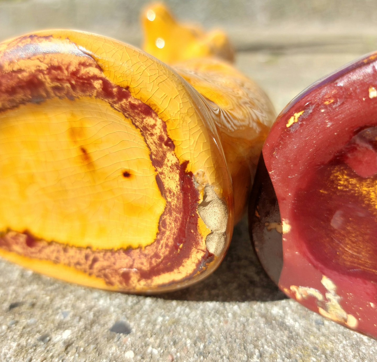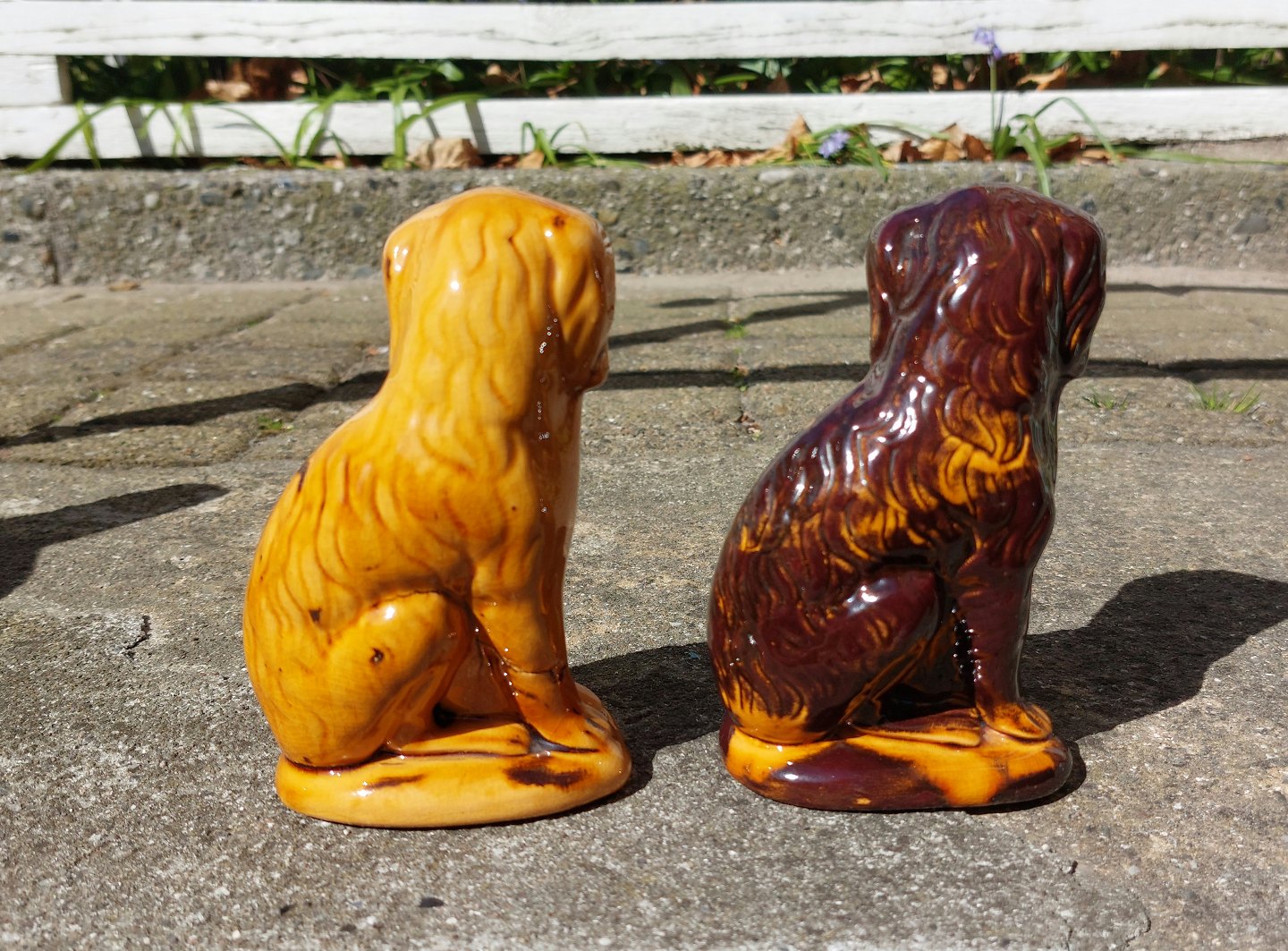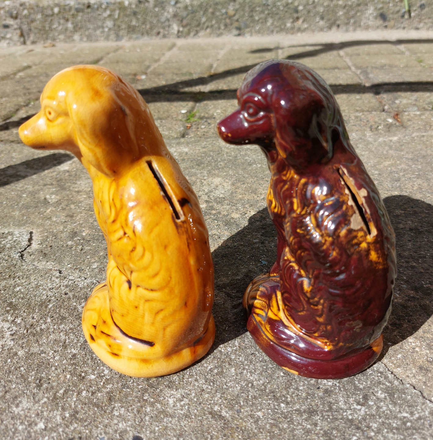 Figur af hund i keramik som sparebøsse. Én i lys gul glasur og én i brun glasur. Fremstillet i Danmark 19. århundrede. Den ene med mindre skår på bunden (se fotos). H. 13½ cm (5.31 inches).