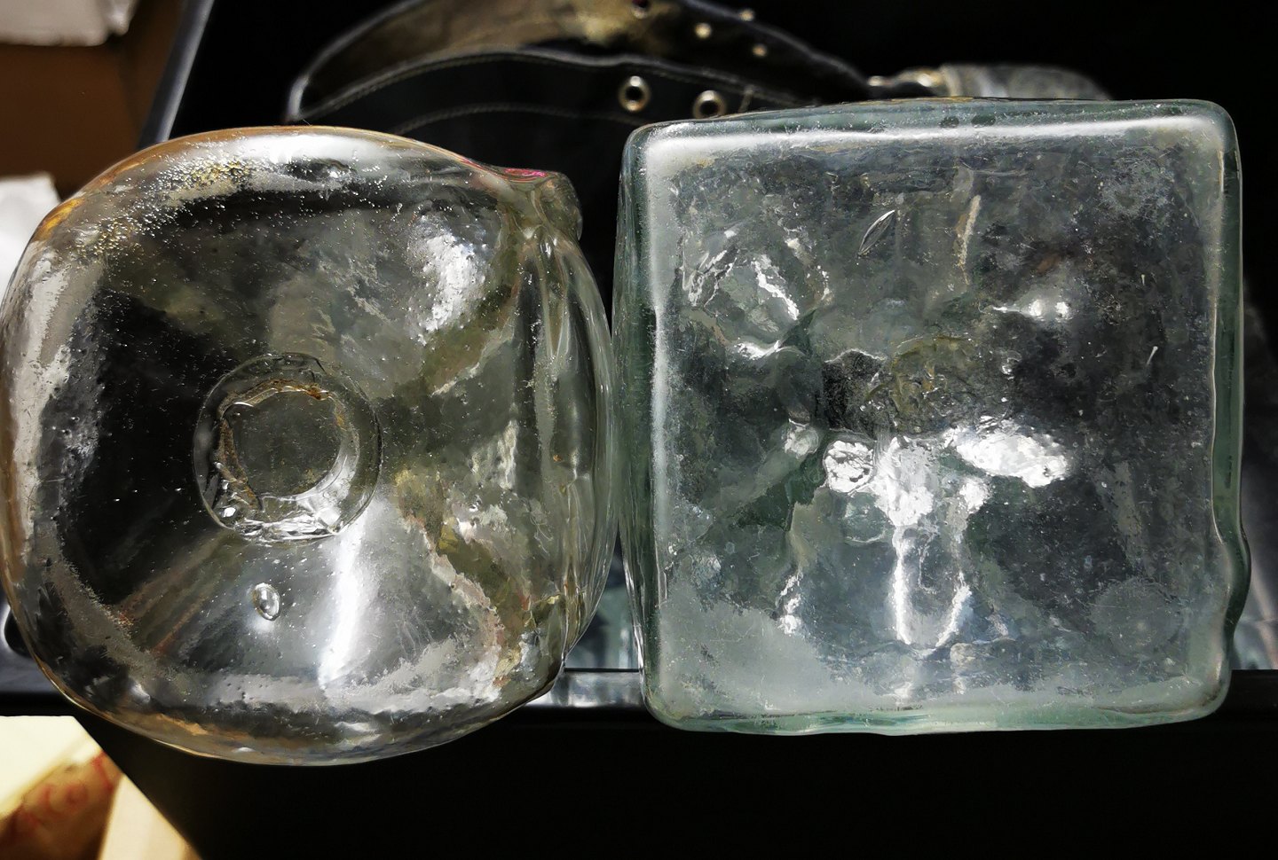 Klukflasken til venstre har nærmest rund bund. Fremstillet omkring 1900. Klukflasken til højre har nærmest firkantet bund. Formodes fremstillet lidt tidligere. Begge karafler i god stand uden skader eller reparationer. Ingen glassyge. Begge anhæftede på bunden. Højde hhv. 26 og 26½ cm. Ikke udboret til prop, hvorfor der ikke er propper til disse karafler.