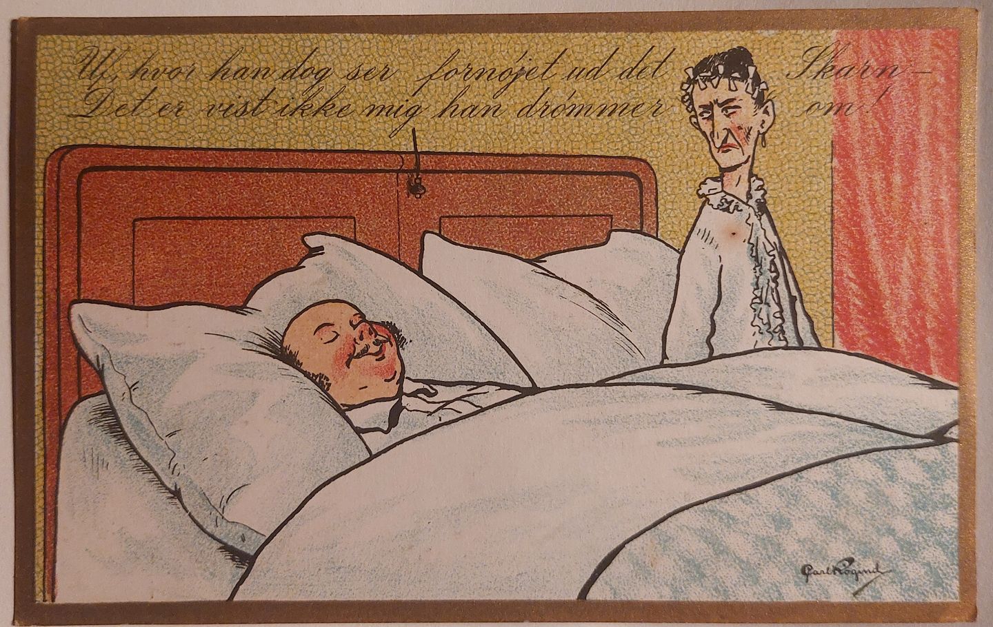 Postkort: Tegnet af Carl Røgind. Sovende ægtefælle. "Uf, hvor han dog ser fornøjet ud det skarn. Det er vist ikke mig han drømmer om" Sendt i 1924. I god stand.
