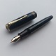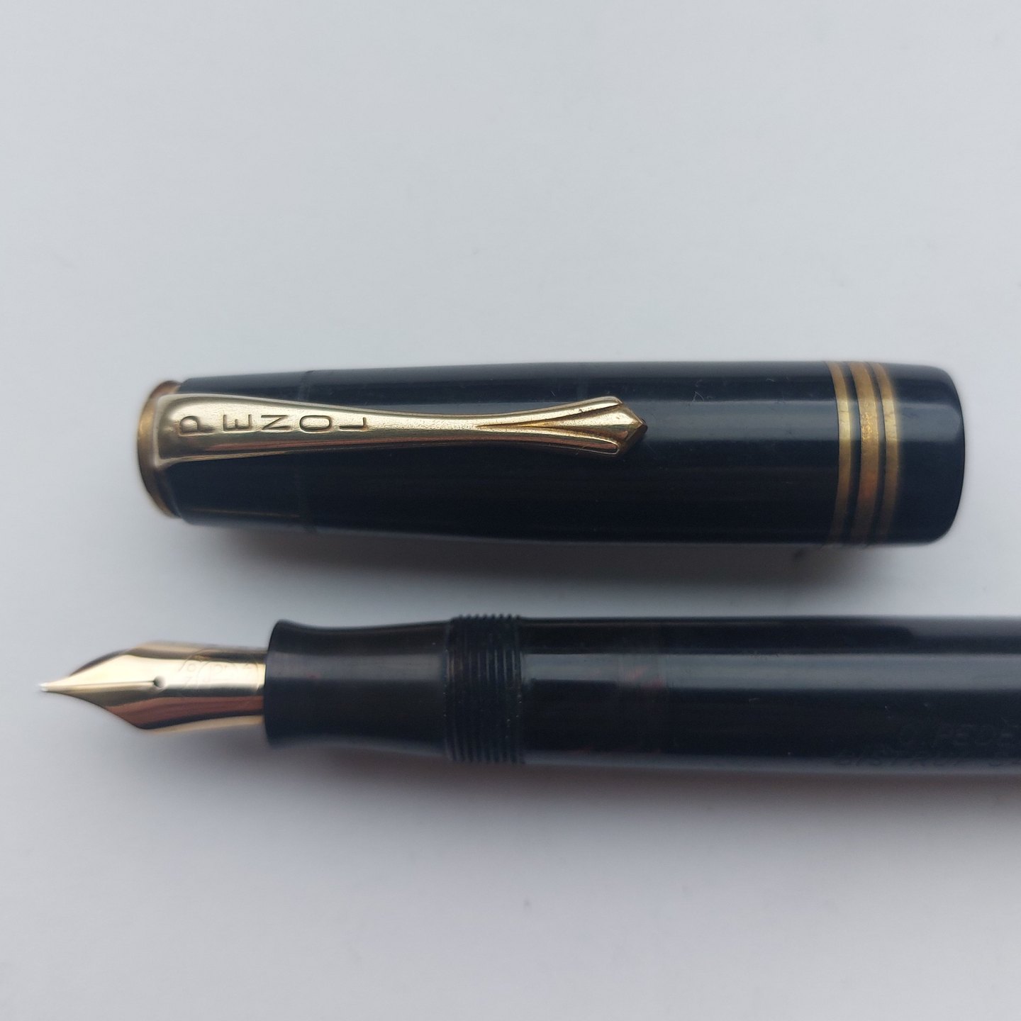 Large cigar: Black Penol Ambassador Senior fountain pen. Push button ink filler. Does not work. A new rubber sac must be inserted before it can hold ink and write again. Engraved with both personal and company name. All parts original Penol parts. The top with the clip is fixed, but slightly crooked. The fountain pen is 13.5 cm long.