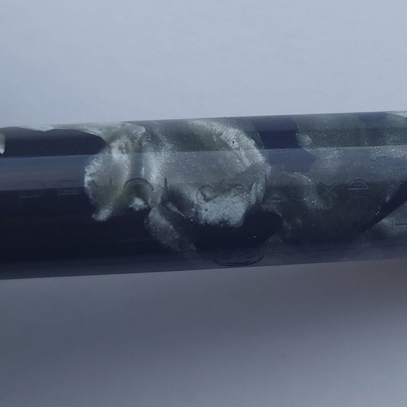 Green marbled Penol de Luxe (0) fountain pen. Push button ink filler. Does not work. A new rubber sac must be inserted before it can again absorb ink and write again. All parts original Penol parts. The fountain pen is 11.8 cm long.