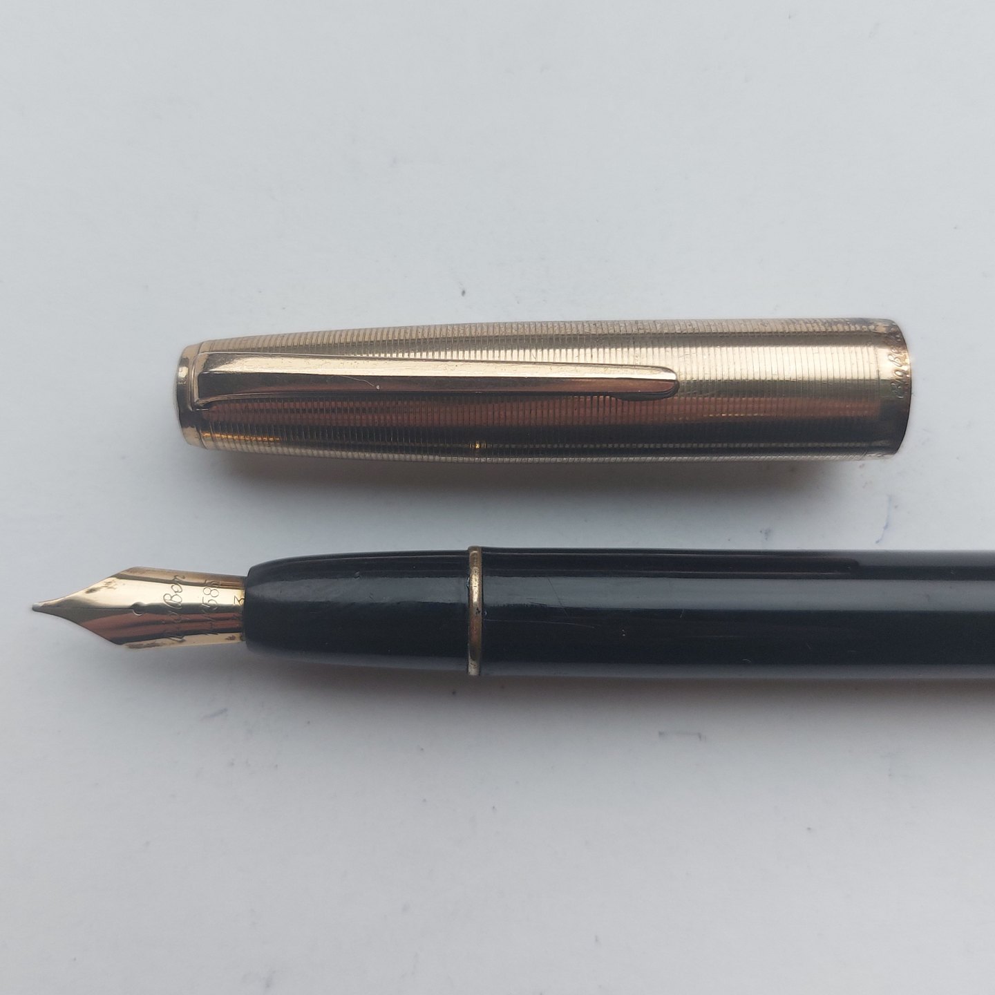 Black Big Ben with double metal cap. Push button ink filler. Does not work. A new rubber bag must be inserted before it can take up ink and write again. Engraved.Big Bem on the cap. Appears in good condition with no damage or repairs. All original Big Ben parts including a 14 carat gold nib. L. 13.7 cm
