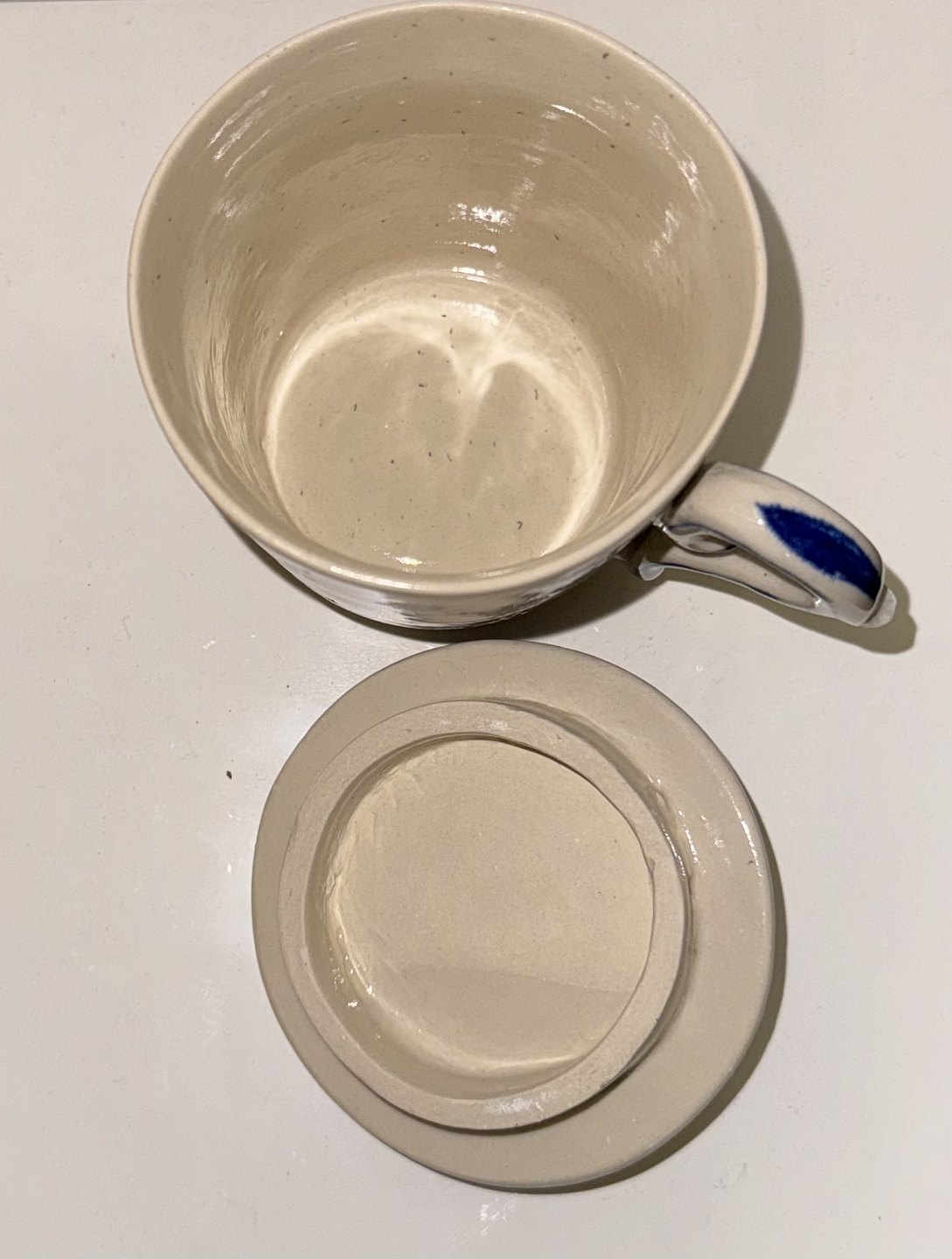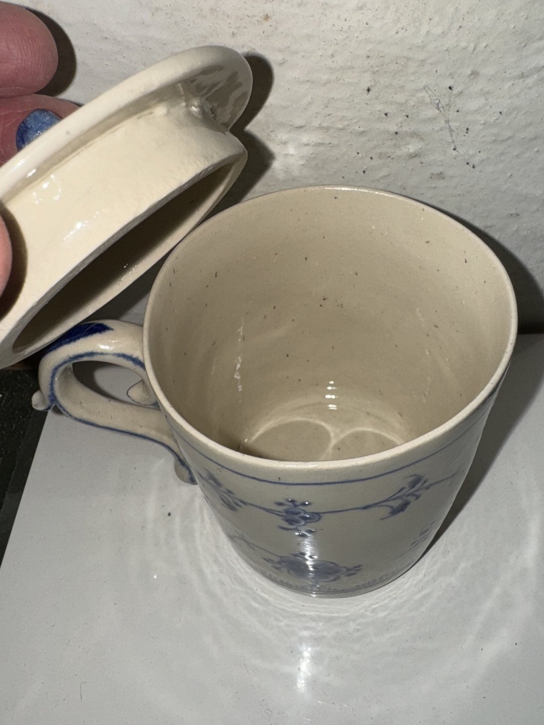 Musselmalet hankekrus med låg. Musselmalet dekoration. På toppen af låget en snegl. På forsiden skrevet "Per". Fremstår i god stand. H. I cl. Låg 11 cm