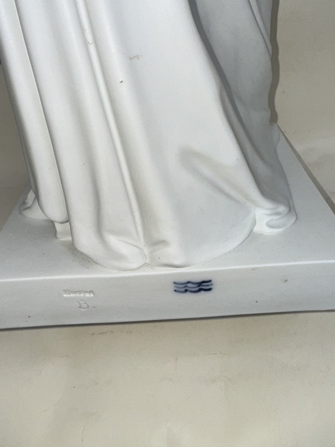 Largest mass-produced Jesus Christ figure in bisquit porcelain from Royal Copenhagen from around 1900. It has been well cared for, which is why only a minor (old) repair is visible on the right index finger. Figure made by Bertel Thorvaldsen (1770-1844). In good condition. The factory mark on the back of the plinth. H. 49.5 cm
