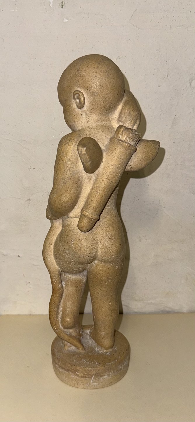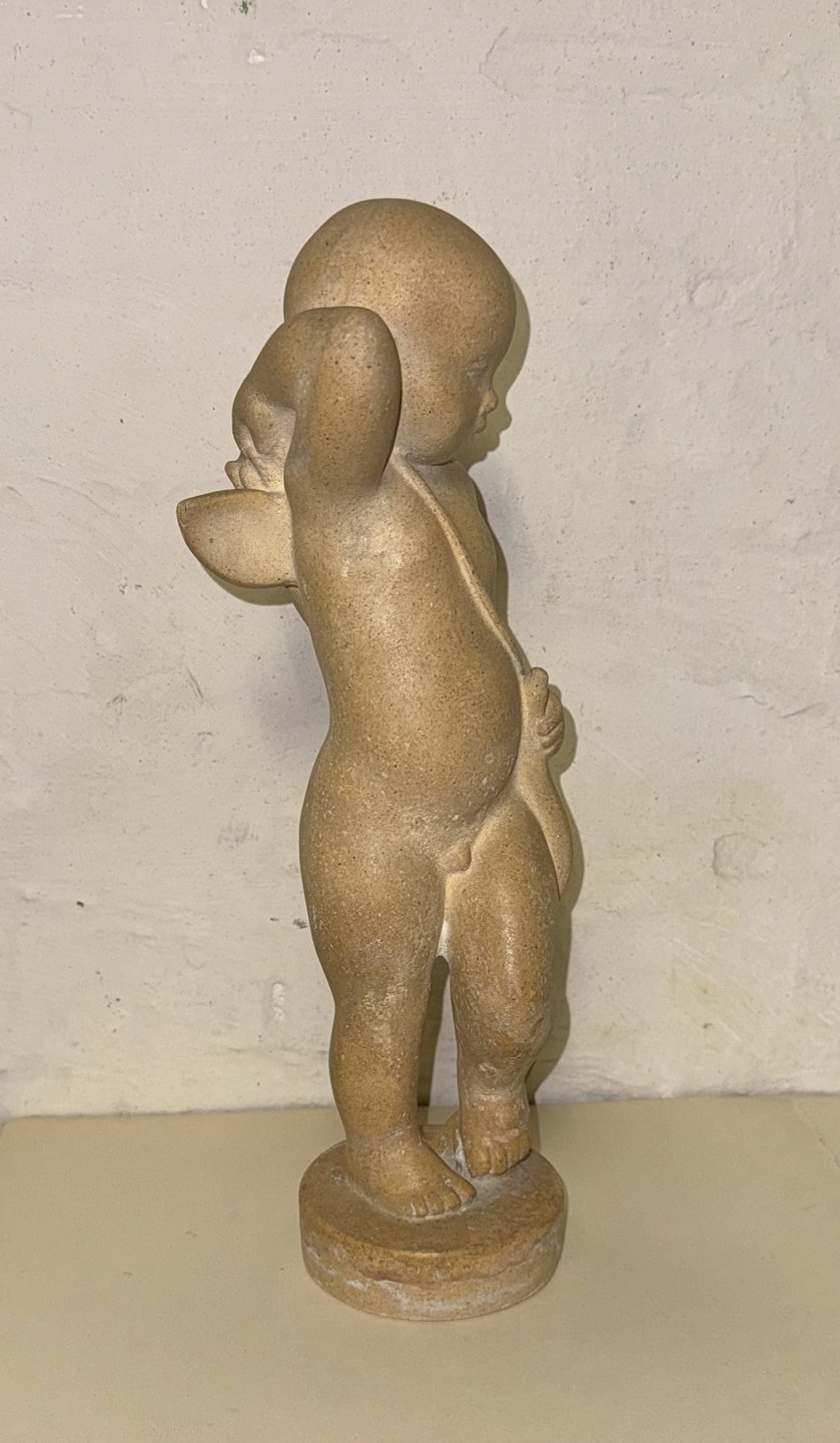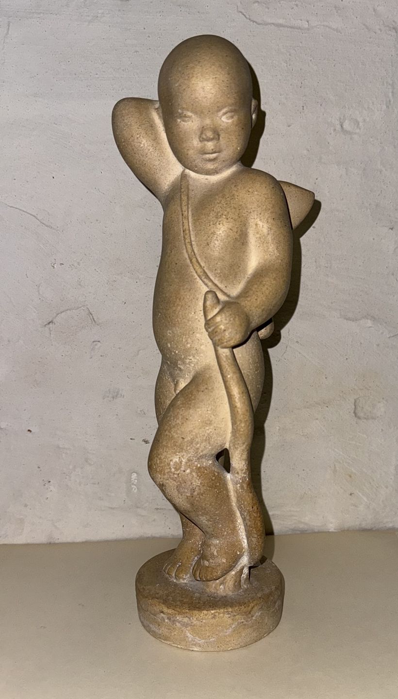 Figur i sandsten. Forestillende Amor med sin bue og pile. Signeret på bagsiden af soklen med LP. For mig ubekendt kunstner. I god stand. Formodes fremstillet omkring 1940. H. 30,5 cm