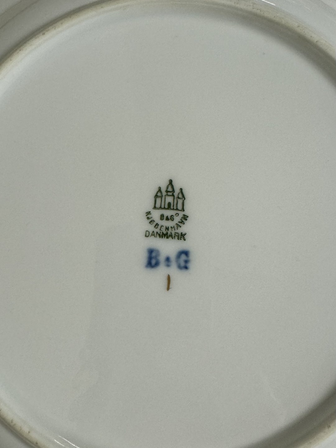 “Herregaard” Middagstallerken fra Bing & Grøndahl. Fremstillet i begyndelsen af 20. århundrede. Dekoreret med guldkant og blomster. Ingen brugsspor. Mål: Ø. 24,5 cm