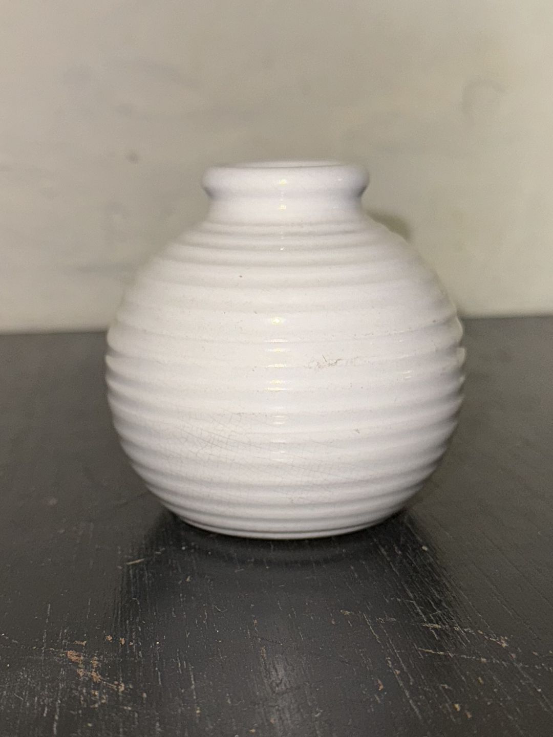 Mindre hvidglaseret rund vase med vandrette riller fra Michael Andersen & Søn. I god stand. Fabriksmærket på bunden. H. 8,4 cm