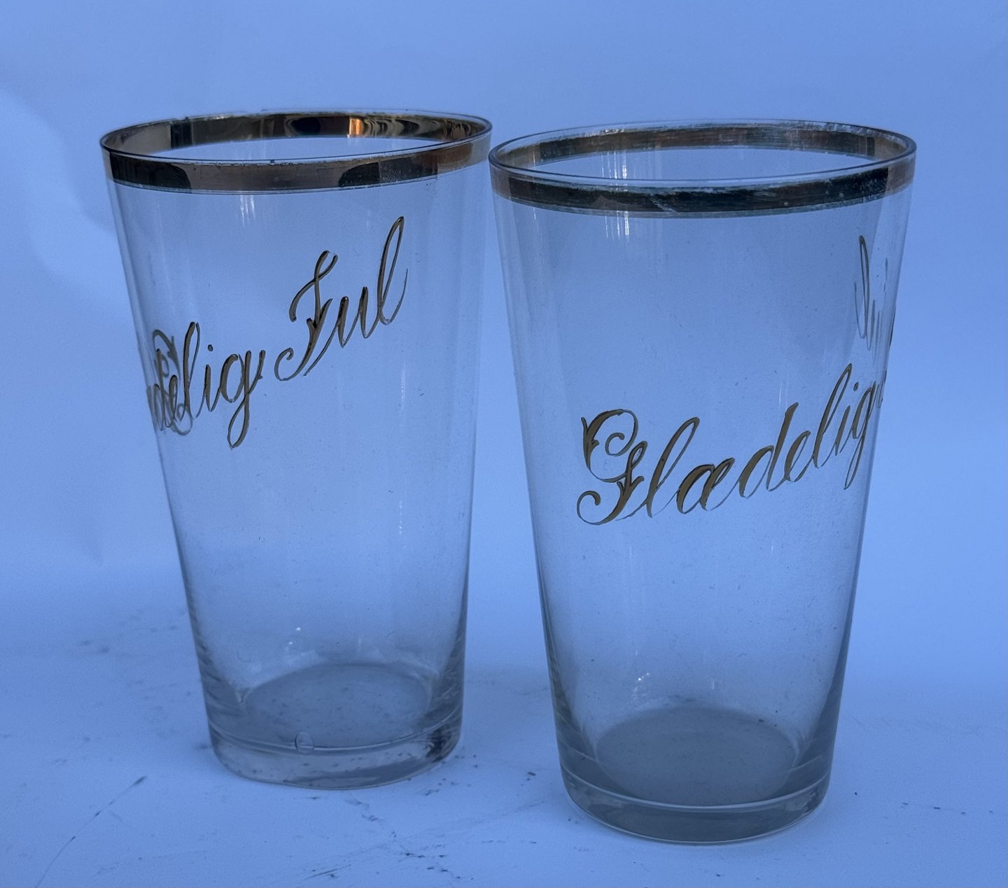 Par vandglas fra Fyens Glasværk ca. 1920. Begge med emaljeret tekst “Glædelig Jul”. Det ene glas har to små skår på den guldbelagte kant (se foto). H. 12,4 cm