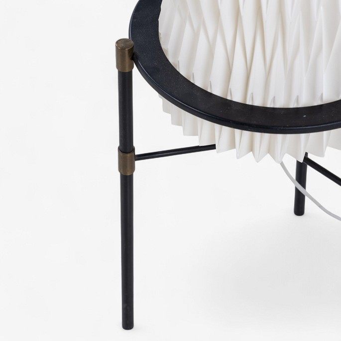 Pair of table lamps on tripod base in black lacquered metal with white pleated shades.