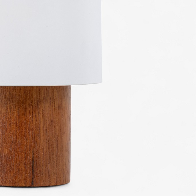 Cylindrical table lamp with a base in patinated teak and a shade in white lacquered metal.