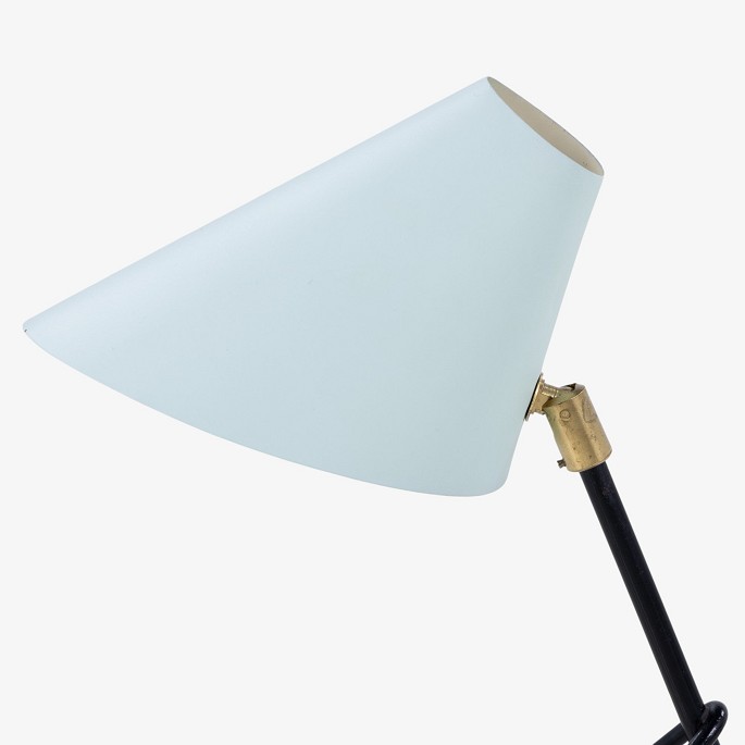 Table lamp in black lacquered metal with brass details and blue shade.