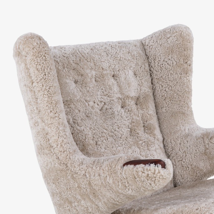 AP 19 - Newly upholstered Teddy Bear chair in lambskin (color: Moonlight) with stool.