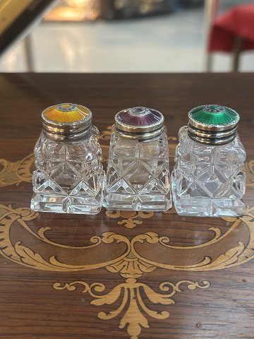 Crystal salt shaker, sterling silver top with enamel, art deco, 1920s, nice and good condition