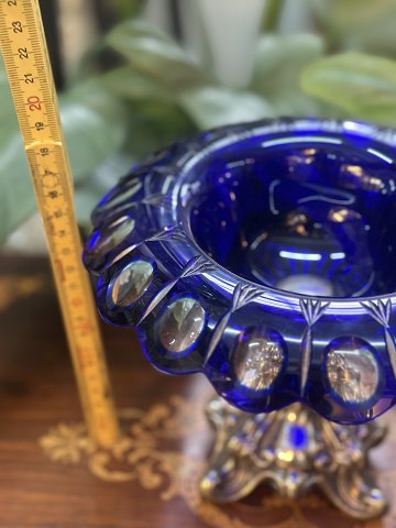 Bohemia Round bowl with wavy edge and large opening mounted on an ornamented metal base in Baroque style. Silver plated with decorated acanthus leaves and curved feet