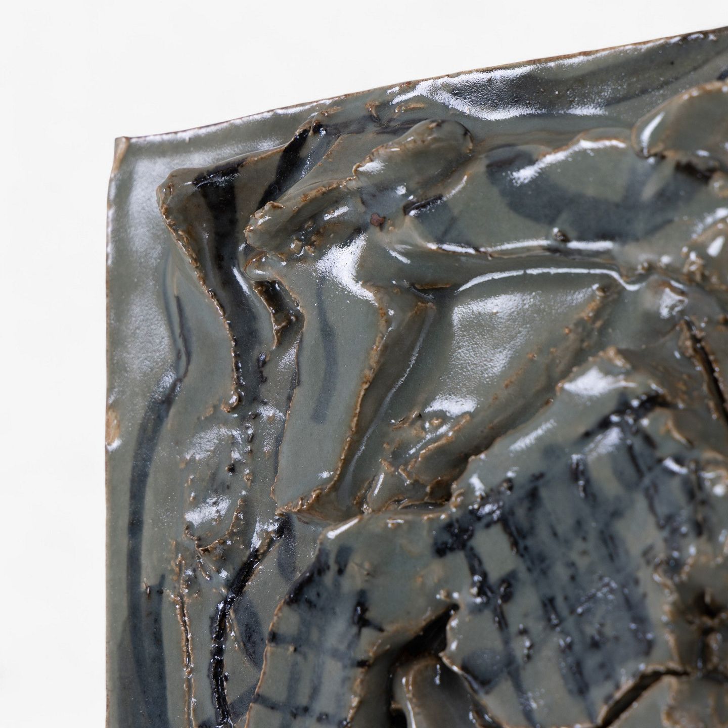 Stoneware relief with abstract shapes and greenish glaze. Signed, MA 67. Manufacturer's stamp.