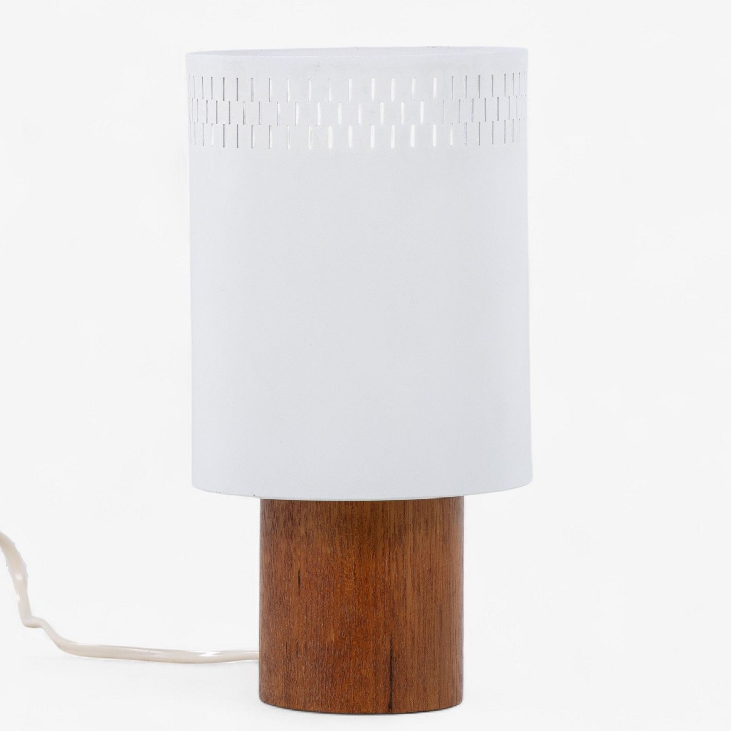 Cylindrical table lamp with a base in patinated teak and a shade in white lacquered metal.